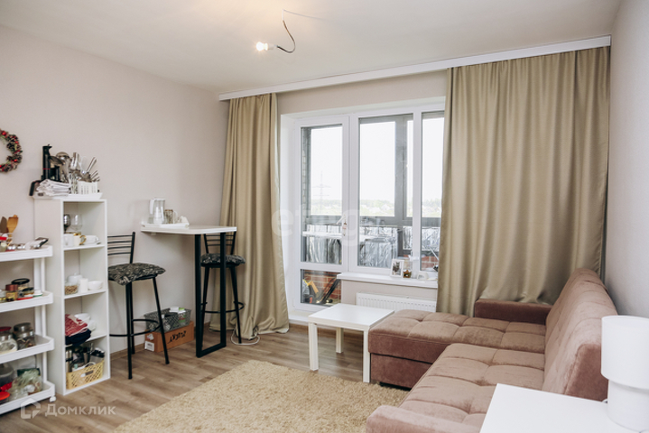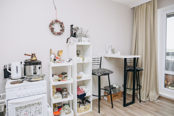 - комфортная планировка: студия органично совмещает зону кухни и зала, оставляя достаточно свободного пространства;
