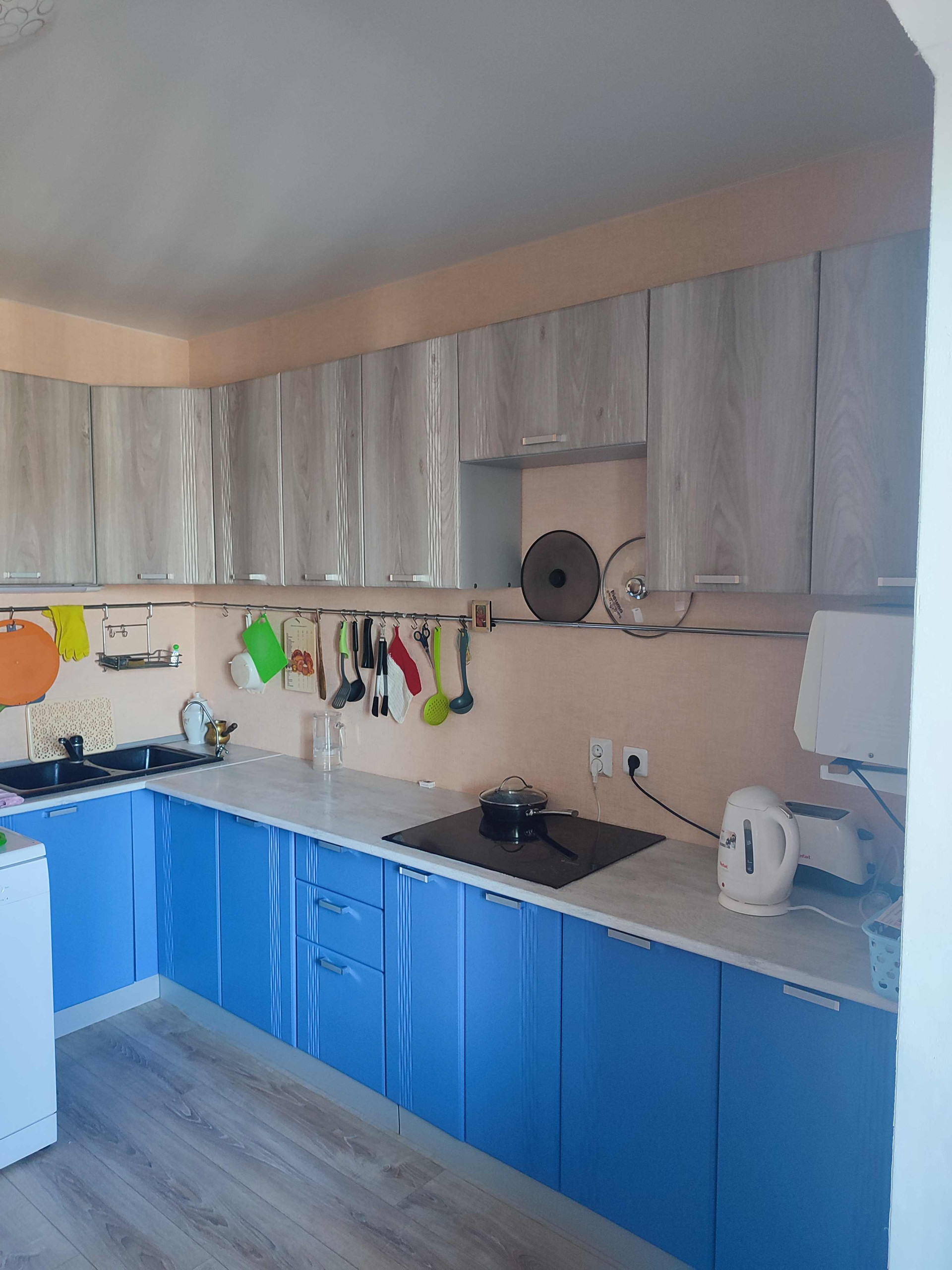 Имеется кухонный гарнитур -б/у всего 1 год, вместительный и чистый,новая варочная встраиваемая плита Гефест, д./шкаф Gorenje,удобная каменная раковина на две чаши