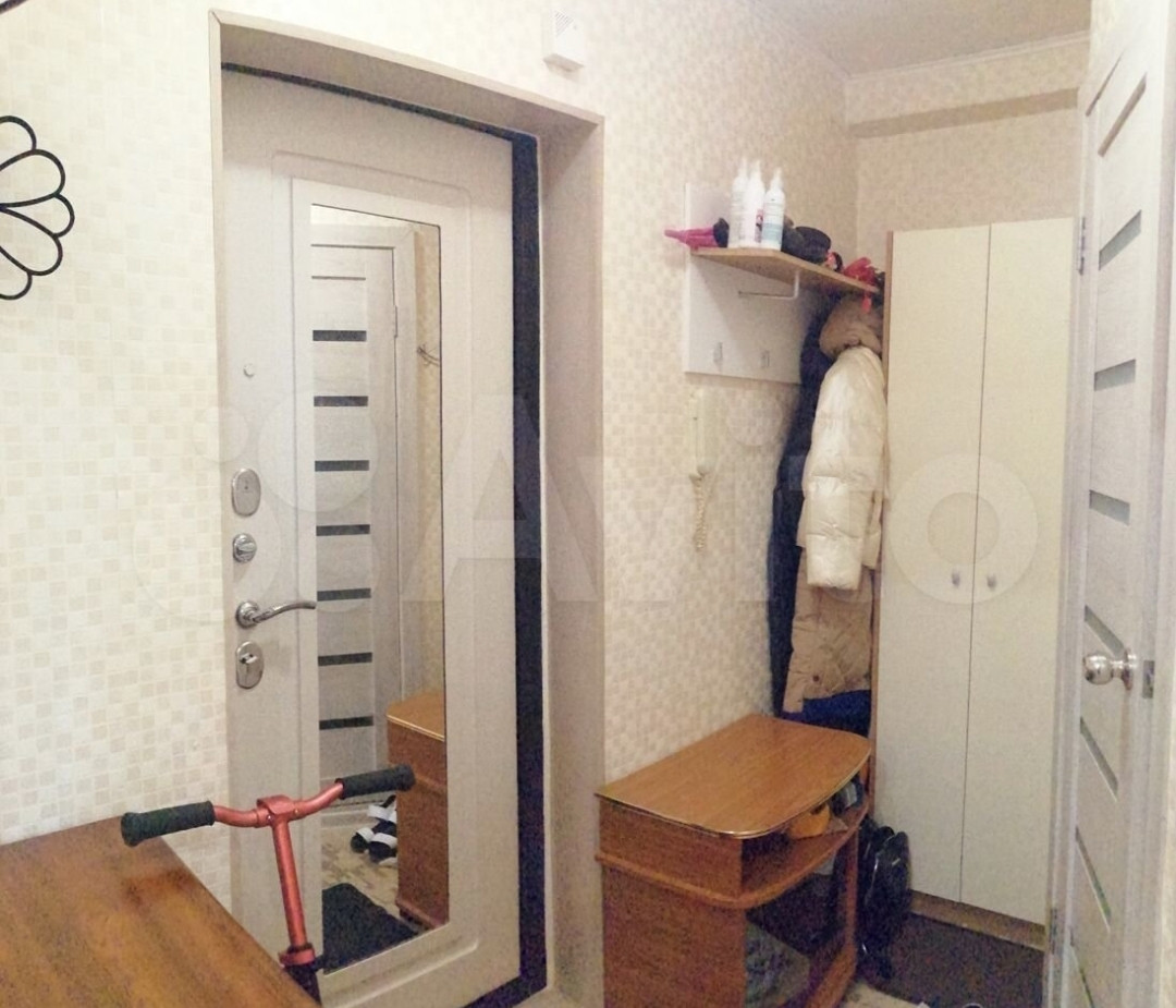 Металлическая входная дверь дополнена зеркалом с внутренней стороны, что экономит пространство.
