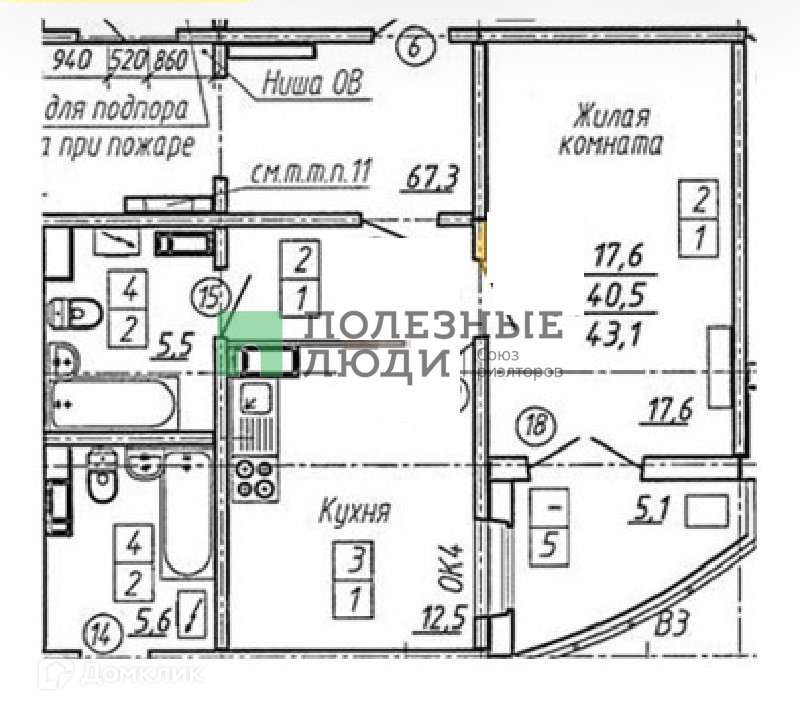 Общая площадь 43.1 м2