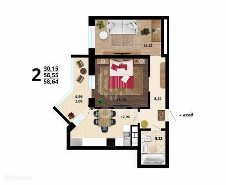 Общая площадь 58.64 м2