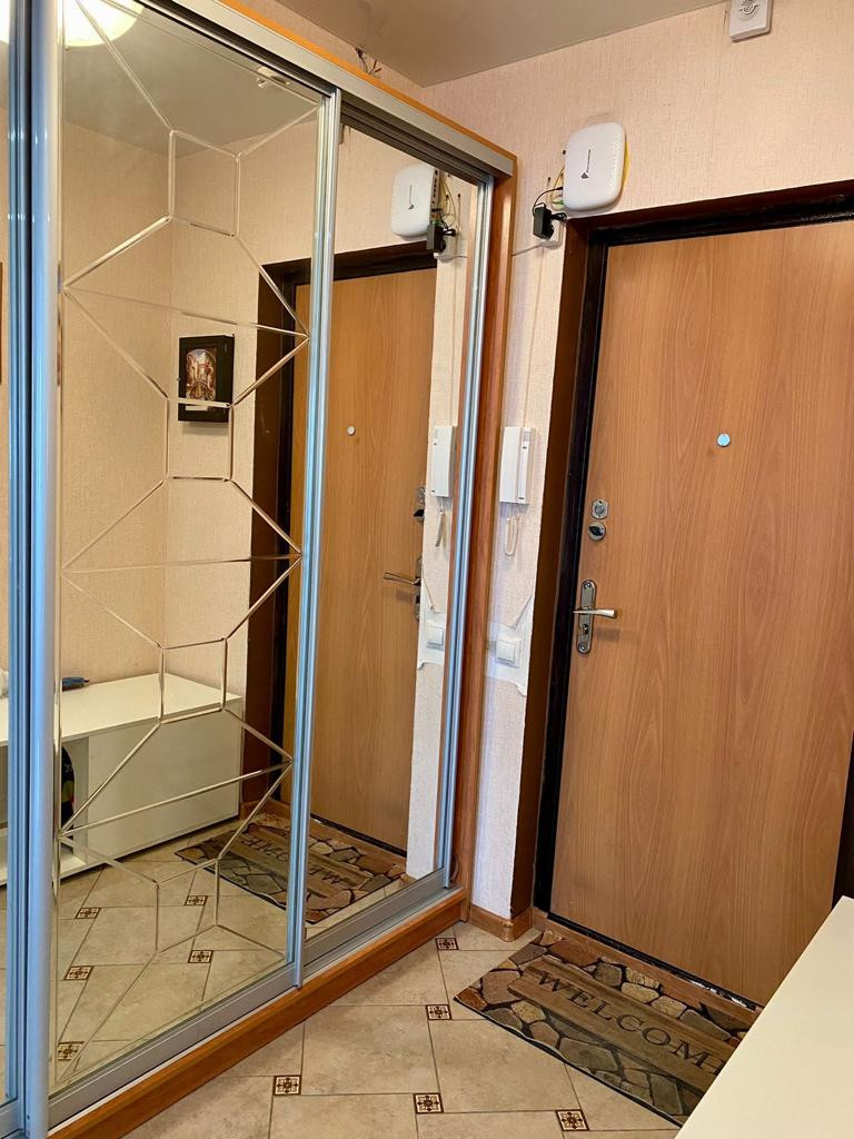 В квартире остаётся кухонный гарнитур со встраиваемой техникой, в коридоре зеркальный шкаф-купе, кондиционер в комнате.