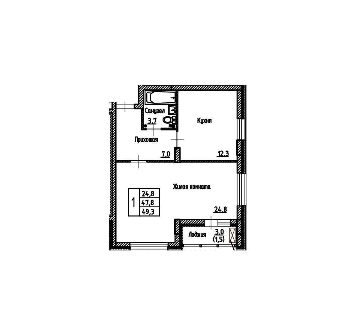 Общая площадь 49.3 м2