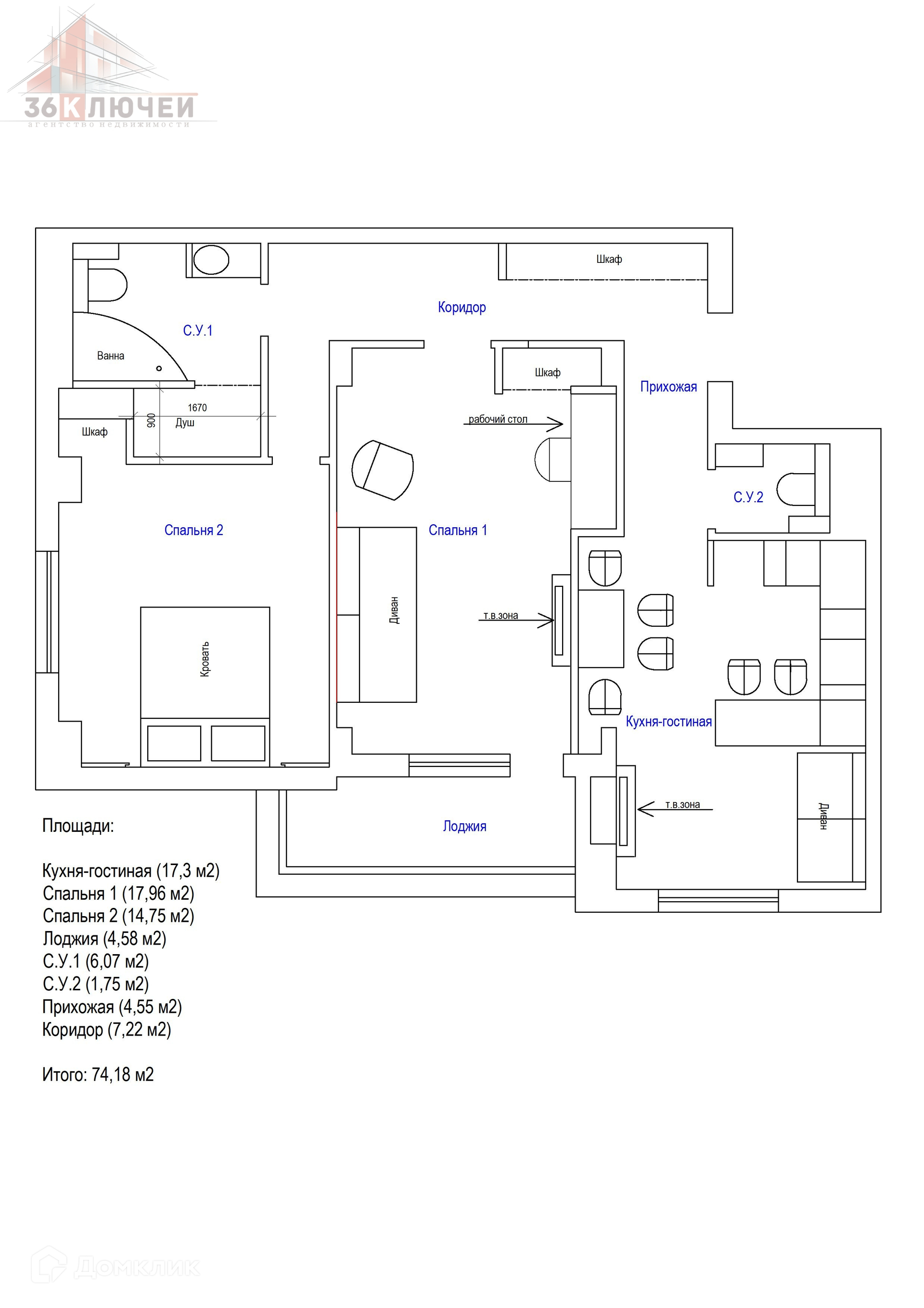 Продаётся современная трёхкомнатная квартира евроформата общей площадью 74 м2: