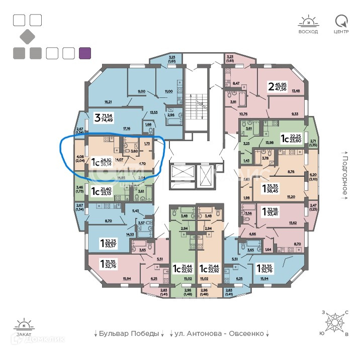 Квартира студия, 24.5 м2, этаж 16 / 17, на продажу в Воронеже, улица Историка Костомарова, 40А