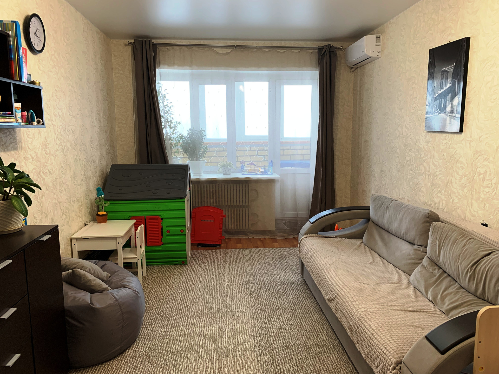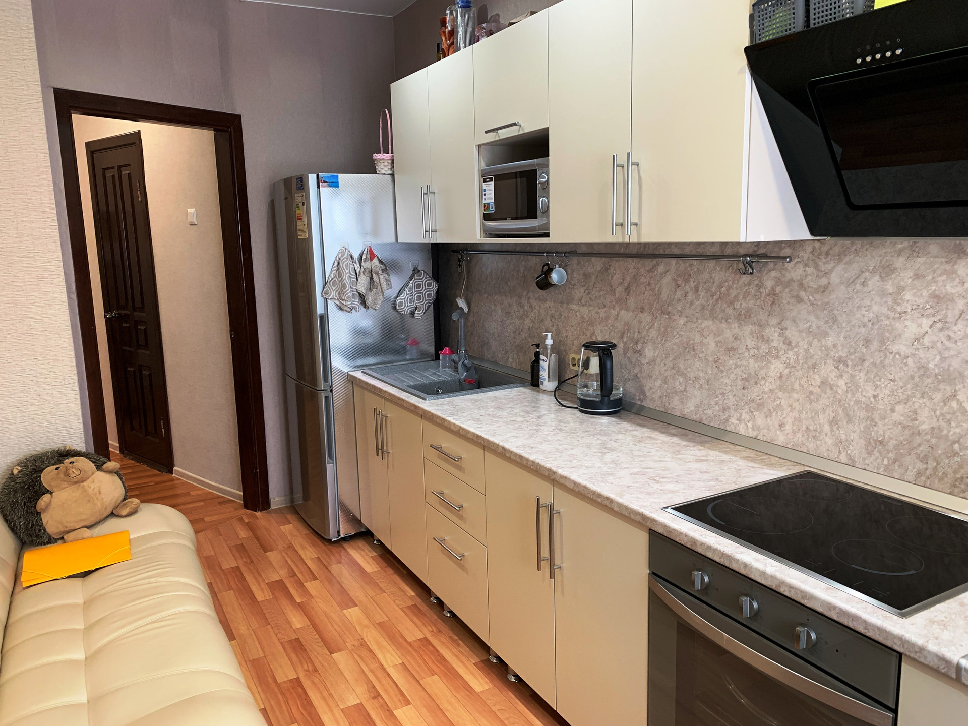 Площадь общая 46,3 м, комната 19 м, кухня 10,4м, холл 11,8м, раздельный с/у. Выход на застекленную лоджию с комнаты. В квартире установлены счетчики тепла (зимой отопление 1600 руб). Остается вместительный шкаф купе в холле, кухня, кондиционер.