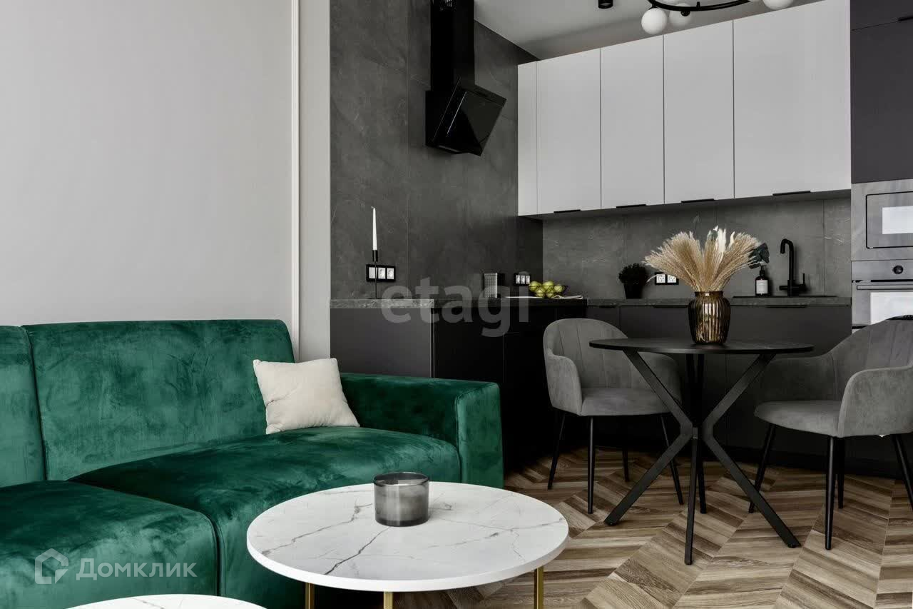 Кухня гостиная - 18,2 кв.м. в современном стиле полностью обставлена всей мебелью. Кухня со встраиваемой техникой Gorenje, встроенным холодильником, посудомоечной машиной и фартуком из широкоформатного керамогранита. В зоне гостиной - большой диван из антивандальной ткани, кондиционер и зона ТВ