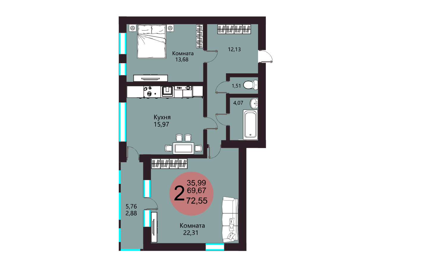 Общая площадь 72.55 м2