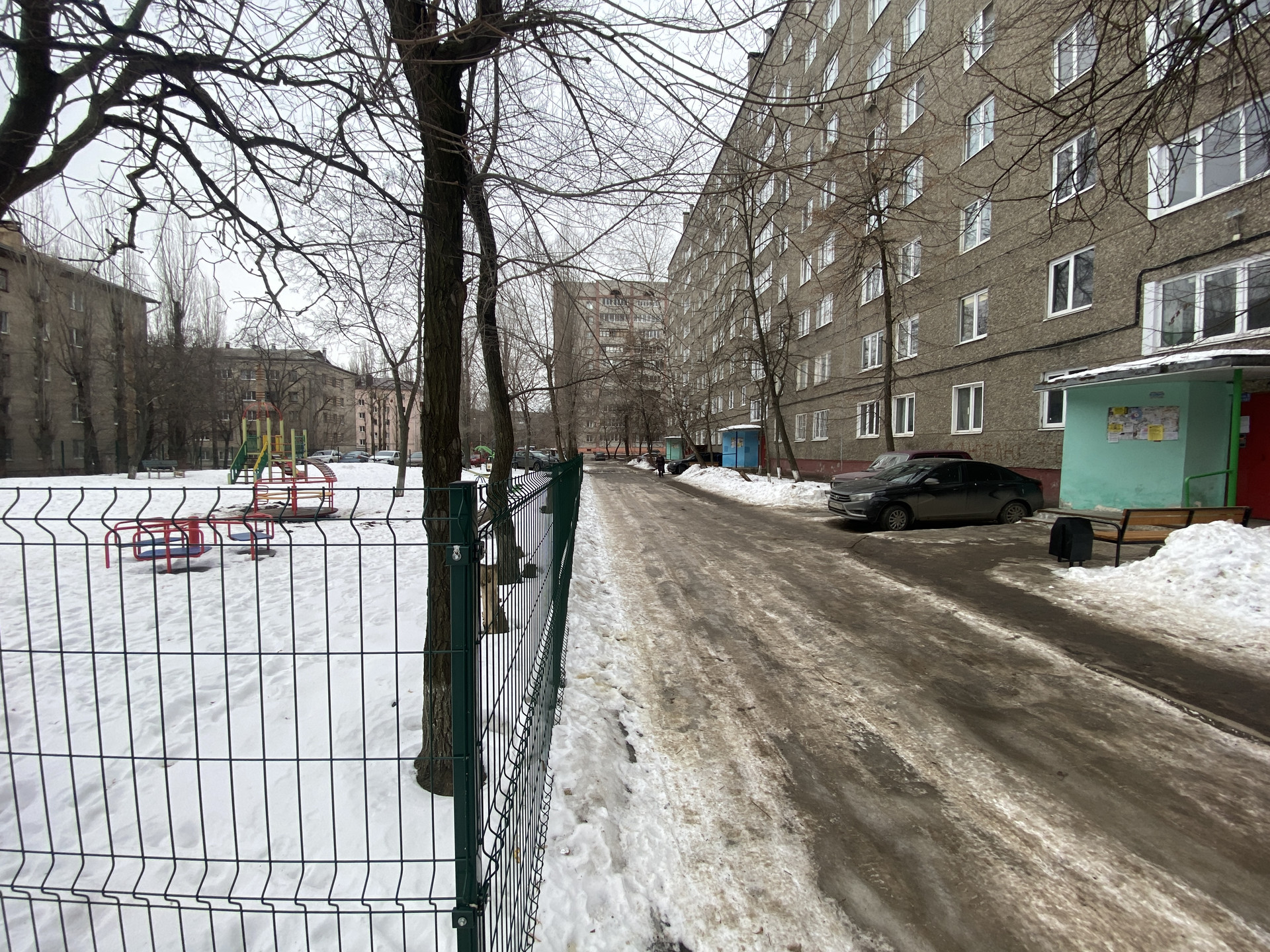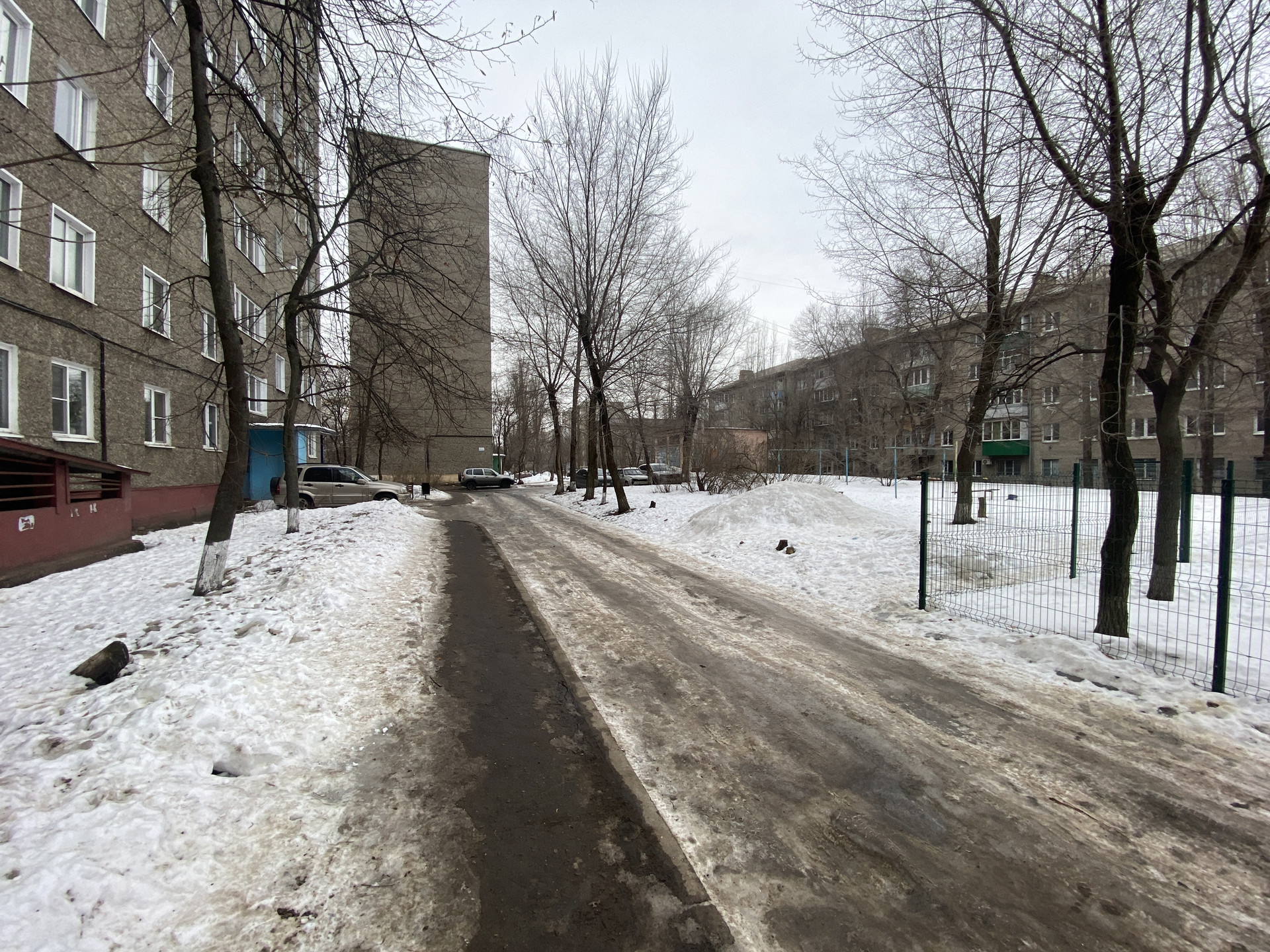 Двор просторный. Во дворе силами жителей дома огородили свою коллективную парковку.