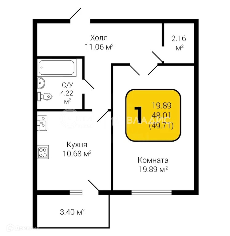 Общая площадь 49.71 м2