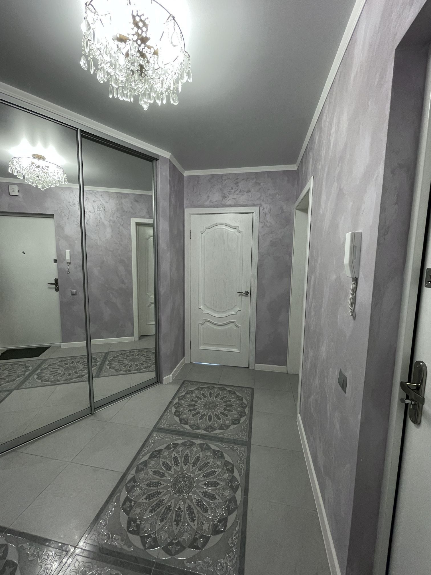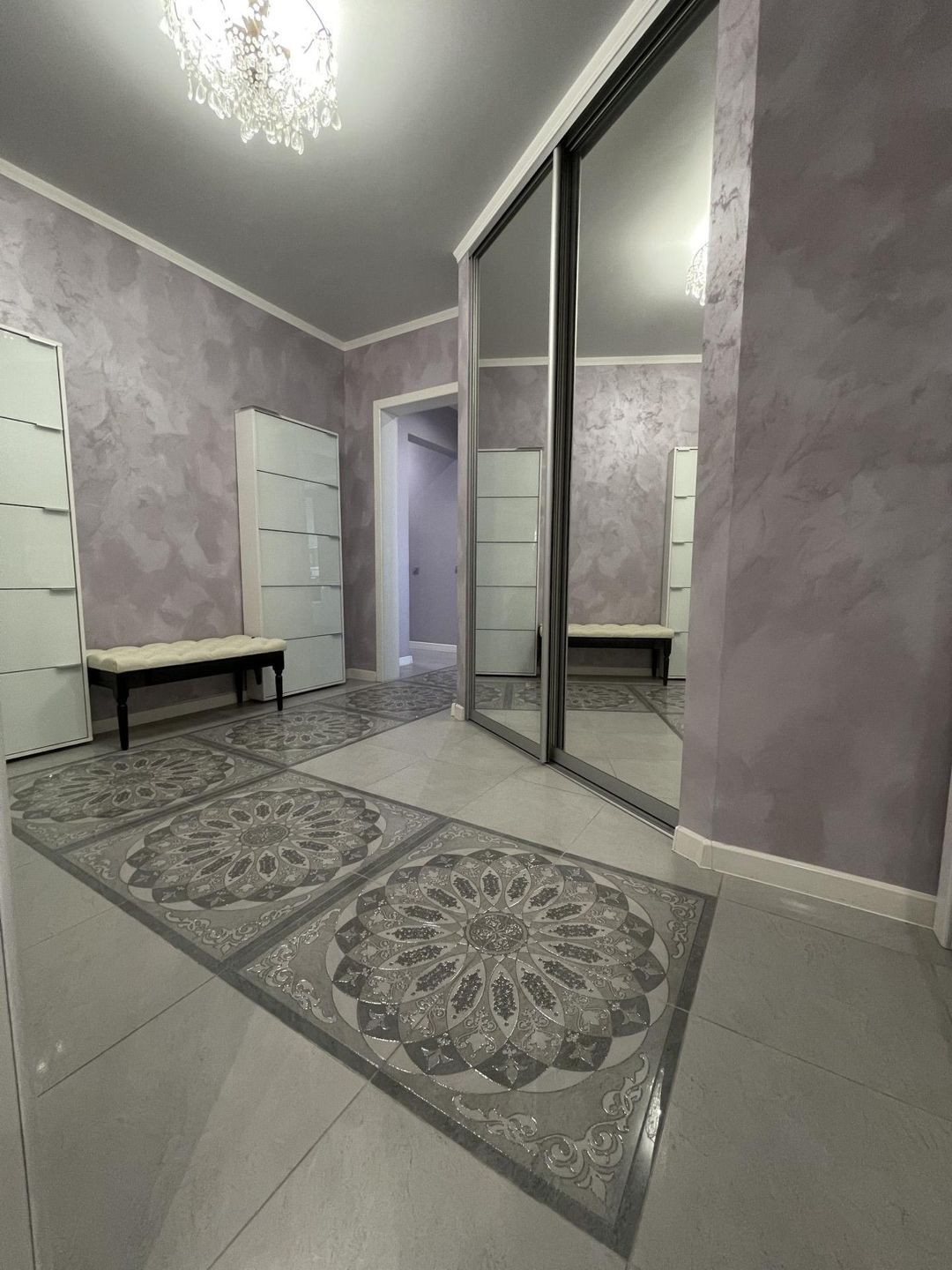 Прихожая площадью 12.9 м2. Встроенная вместительная гардеробная с зеркальными дверьми-купе.