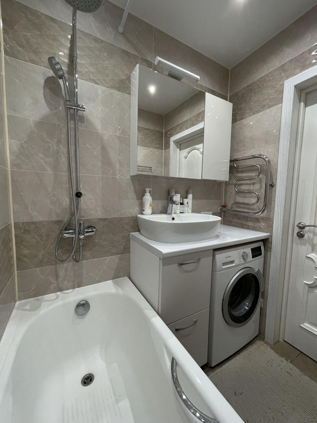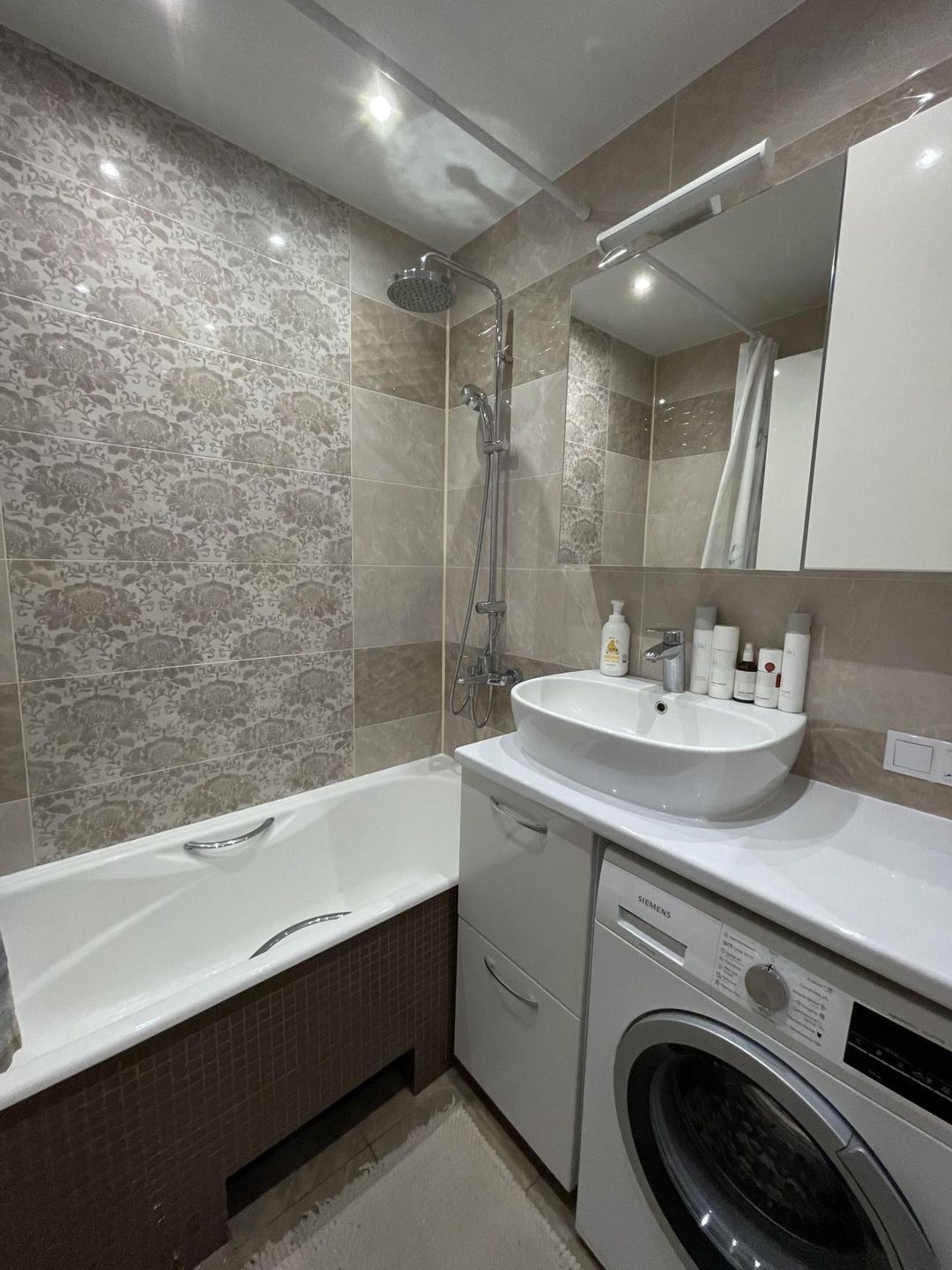 Ванная площадью 2.9 м2. Плитка Kerama Marazzi, ванна чугунная Roca, смесители и тропический душ Grohe.