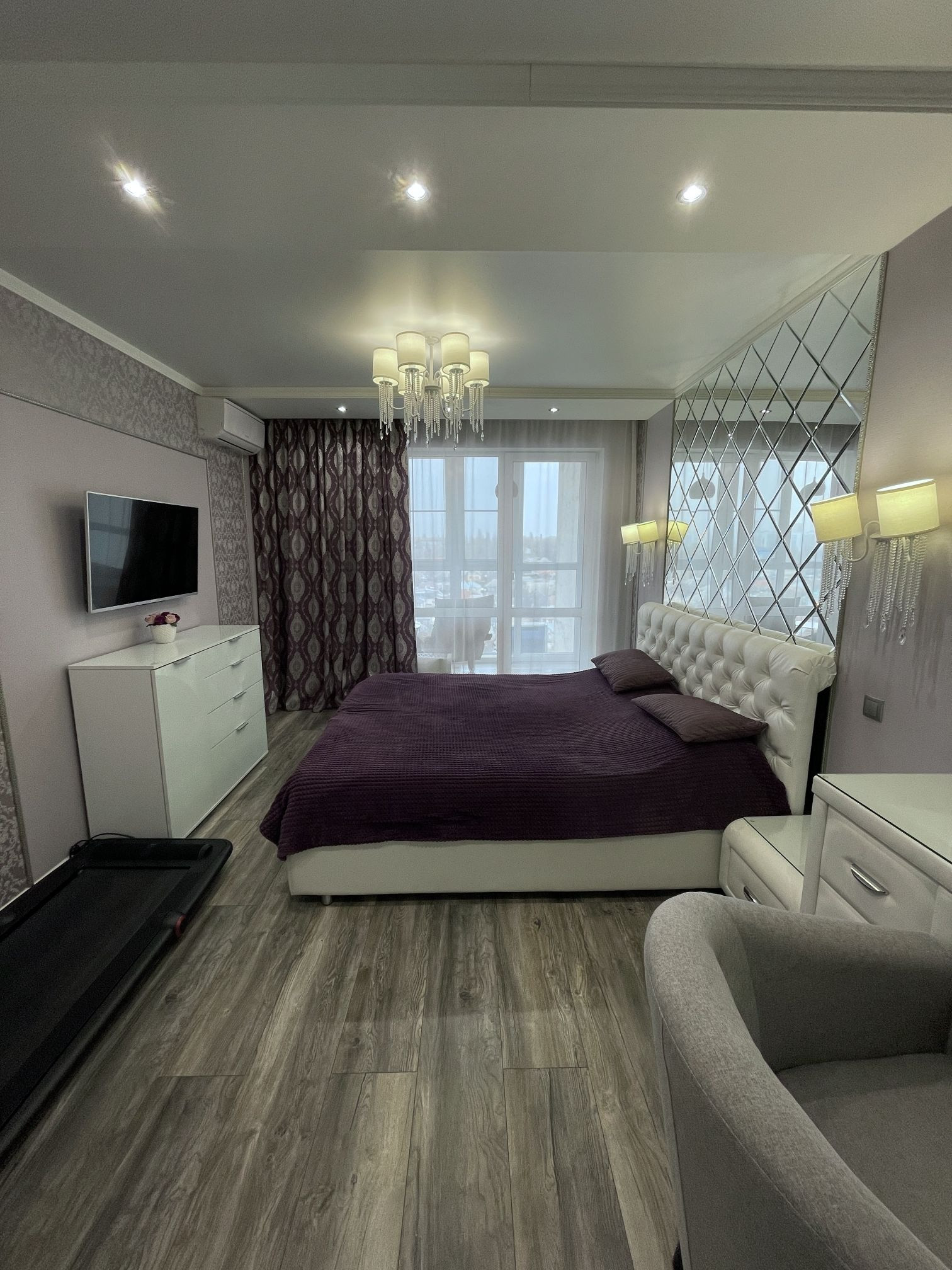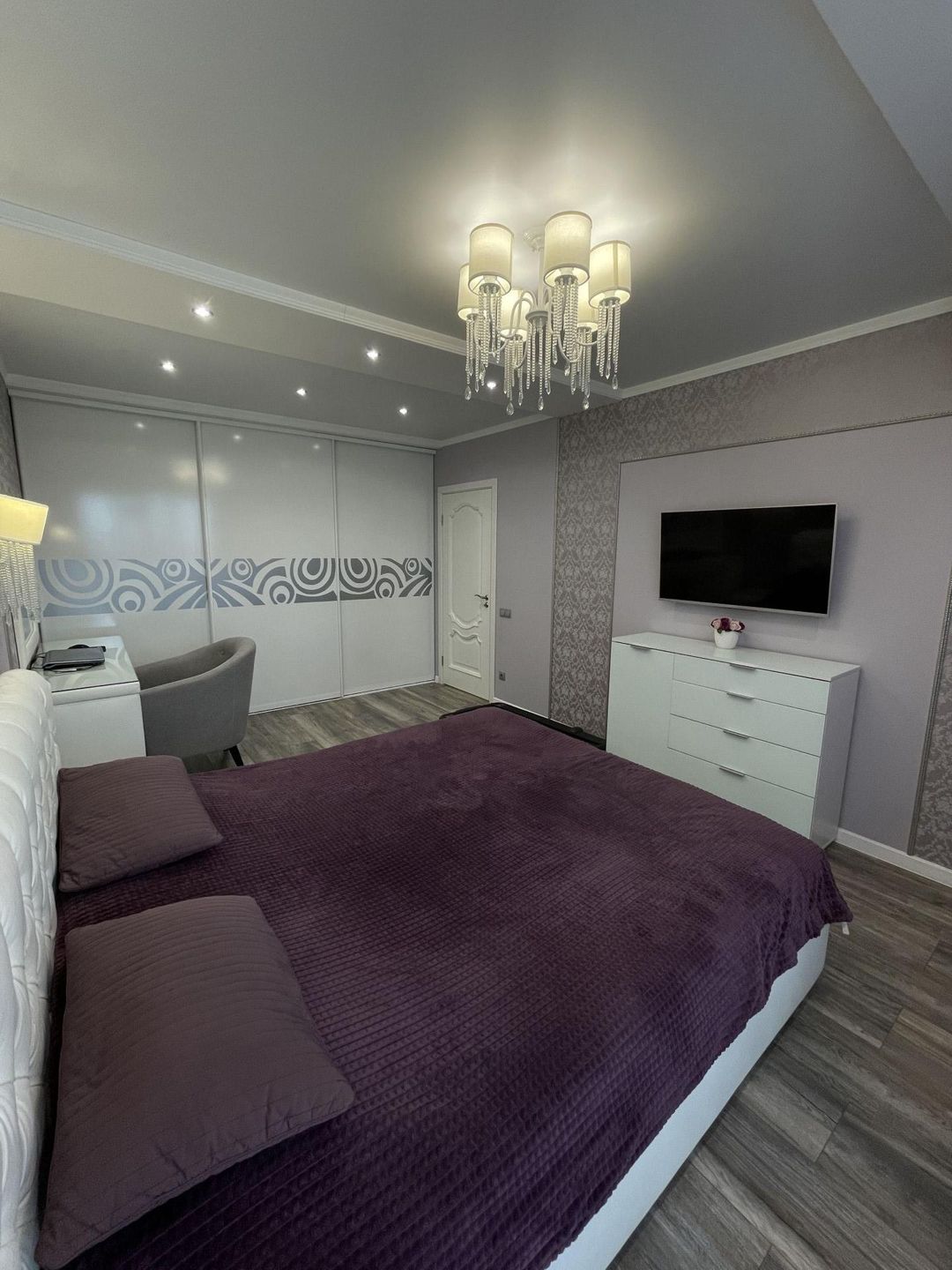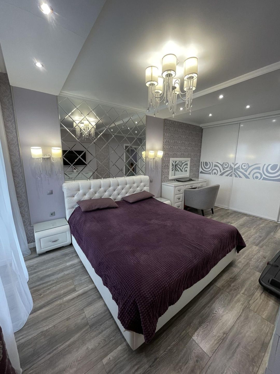 Спальня площадью 19.6 м2. С вместительным гардеробным шкафом. Кровать, прикроватные тумбы, туалетный столик, люстра и 2 настенных бра.