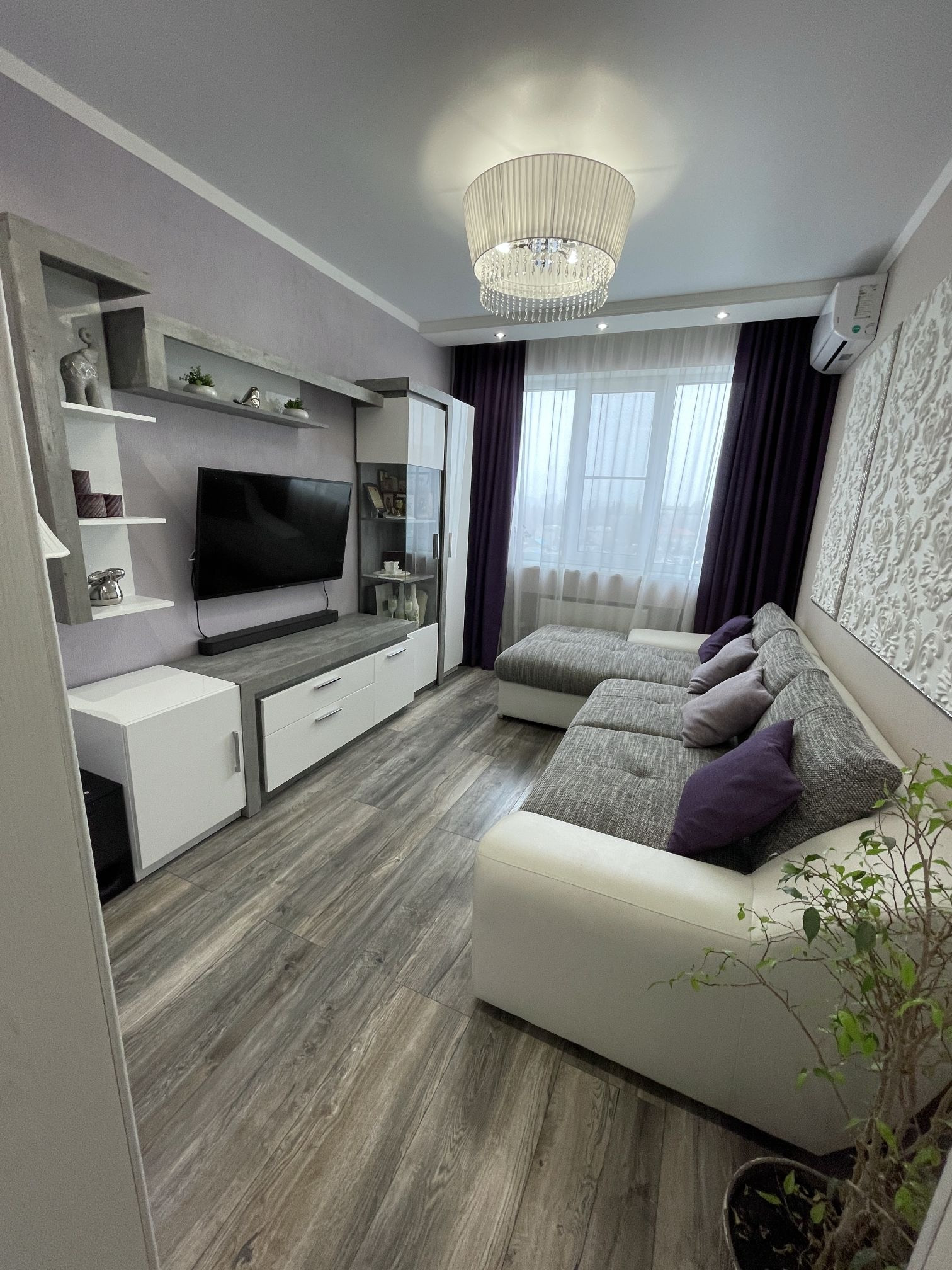 Гостиная  площадью 11.3 м2 . Модульный гарнитур, угловой диван (раздвижной), люстра.