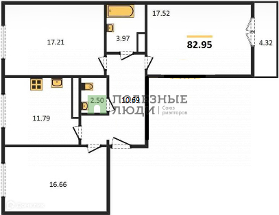 три просторные, светлые комнатами 17,52, 17,2 и 16,66 м²