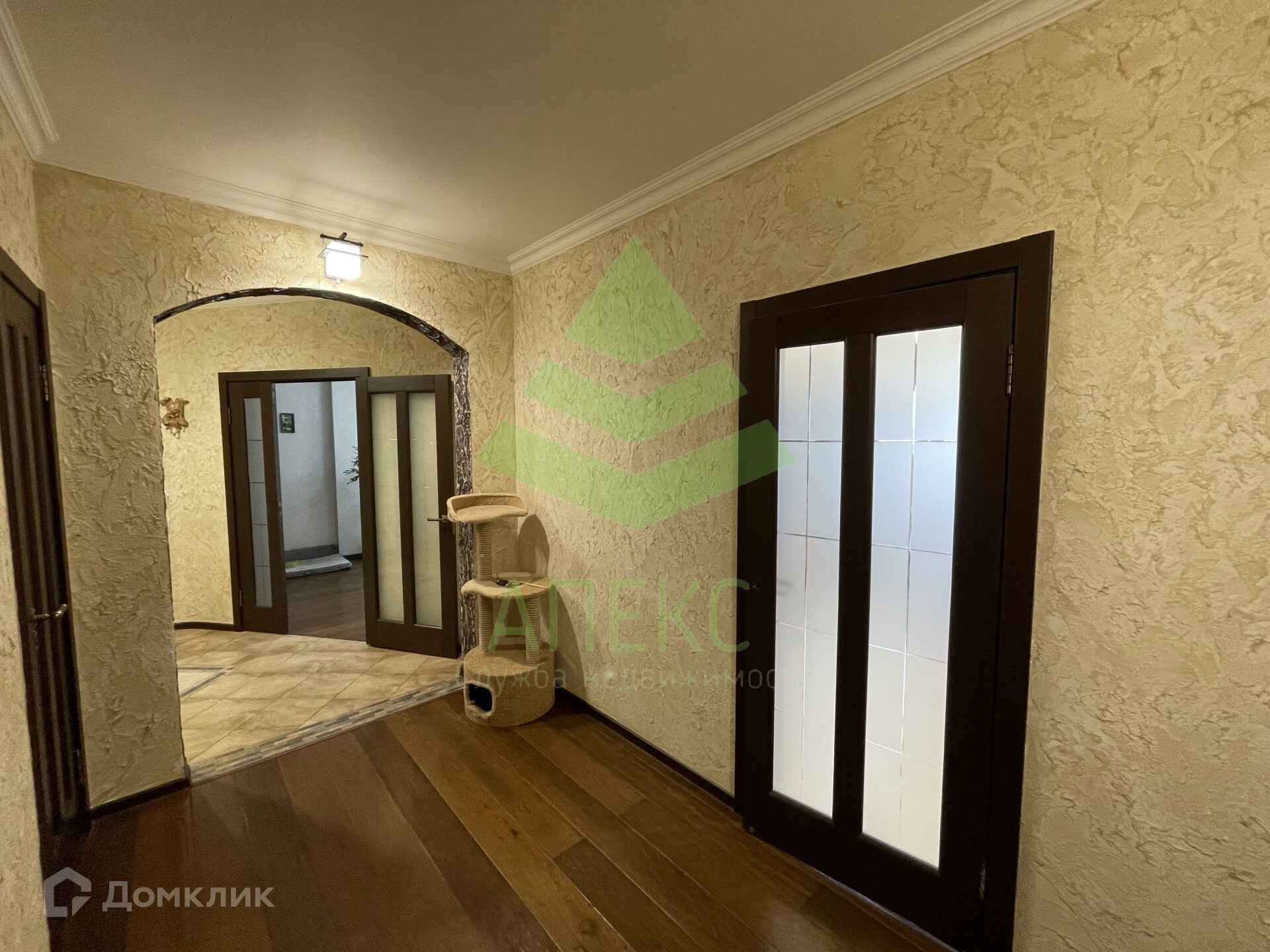 -Пол на кухне, гардеробной и в холле плитка. В остальных комнатах паркетная доска.