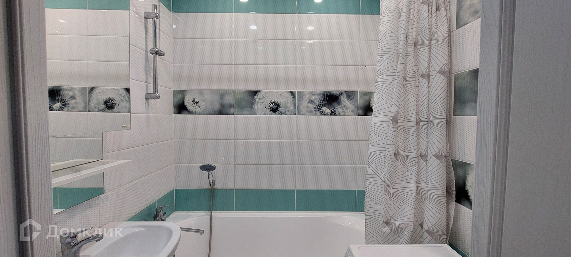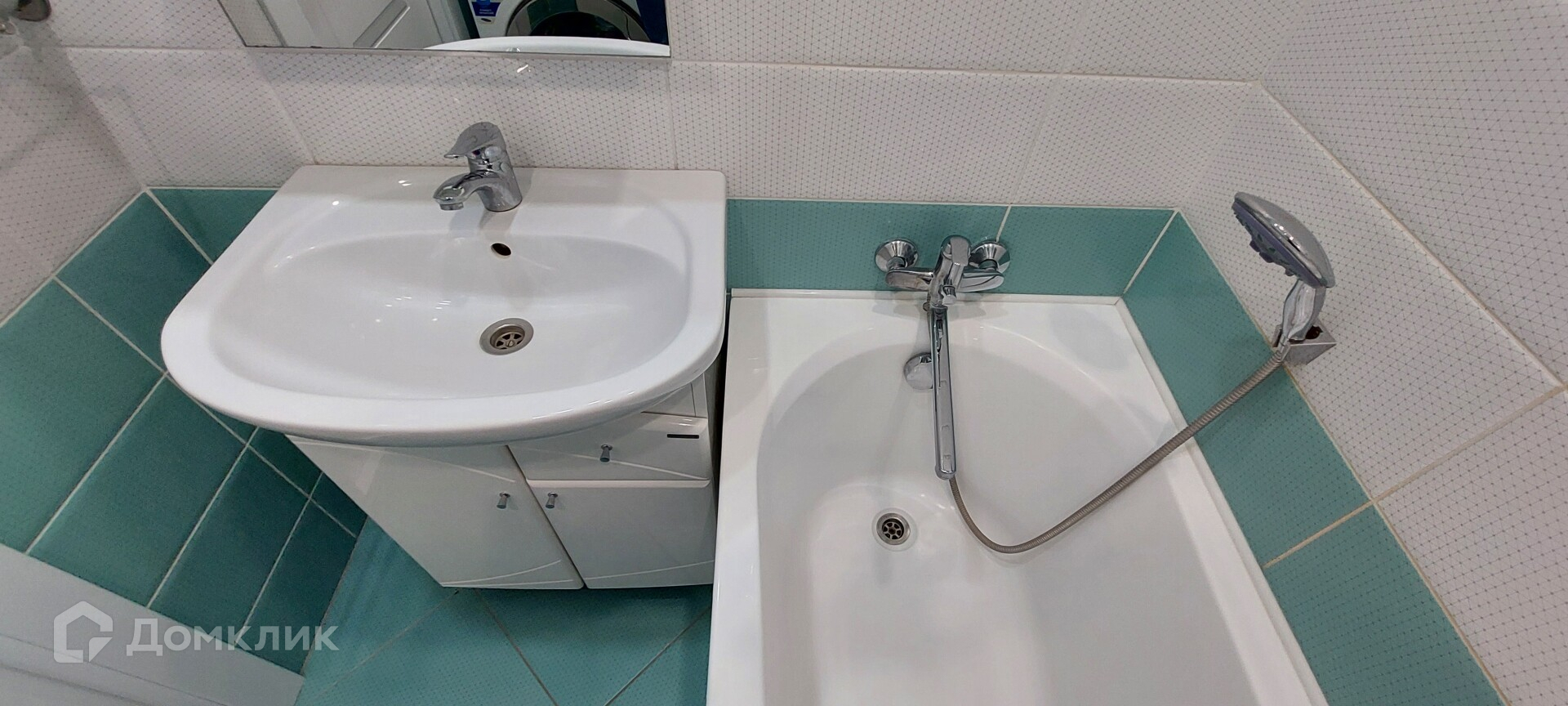 Ванная комната - 4м2, выложенная плиткой, установлена раковина, тумба, стиральная машина.