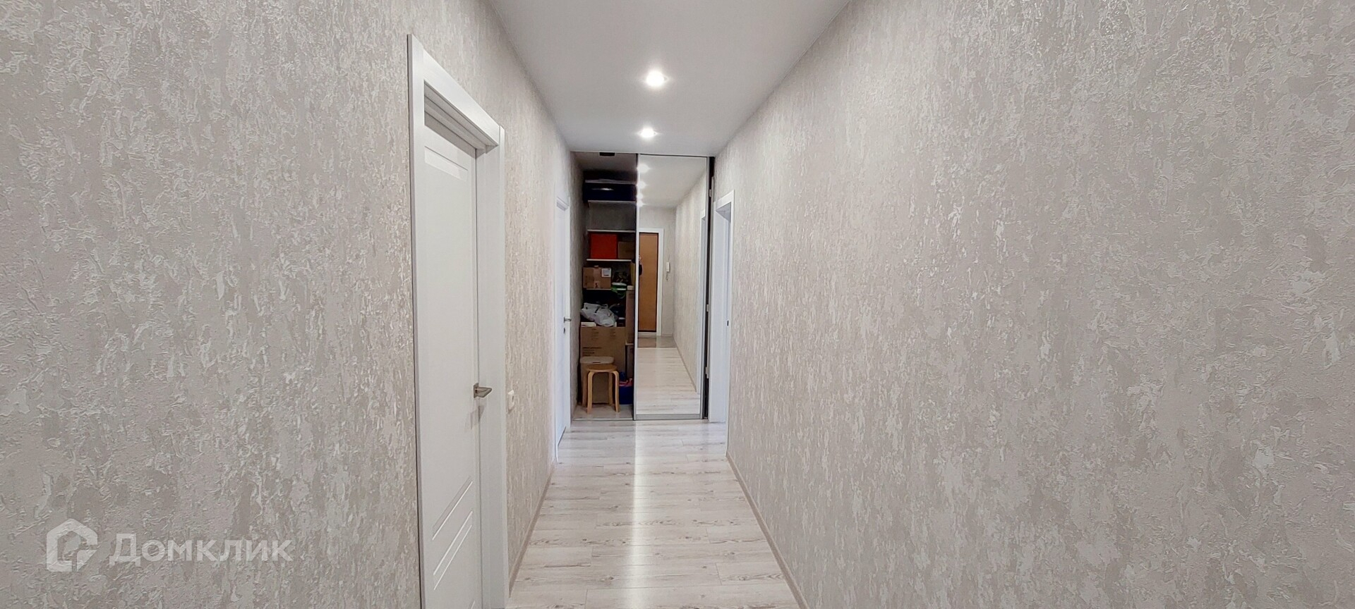 Коридор - 10м2 оборудован гардеробной с зеркальными дверьми. В гардеробной установлена система хранения от Ikea «Альгот».