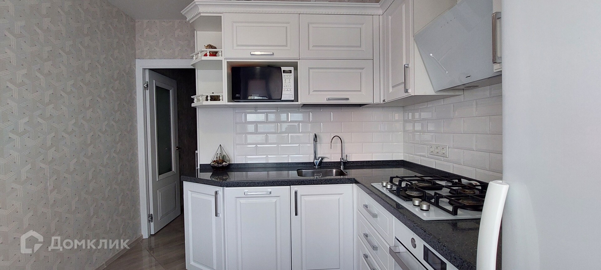 Кухонная техника: Газовая плита; Духовой шкаф; Вытяжка; Микроволновая печь; Посудомоечная машина.