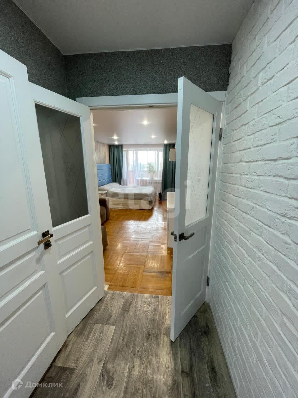 Коридор, пол линолеум, стена декорирована кирпичом, натяжные потолки.