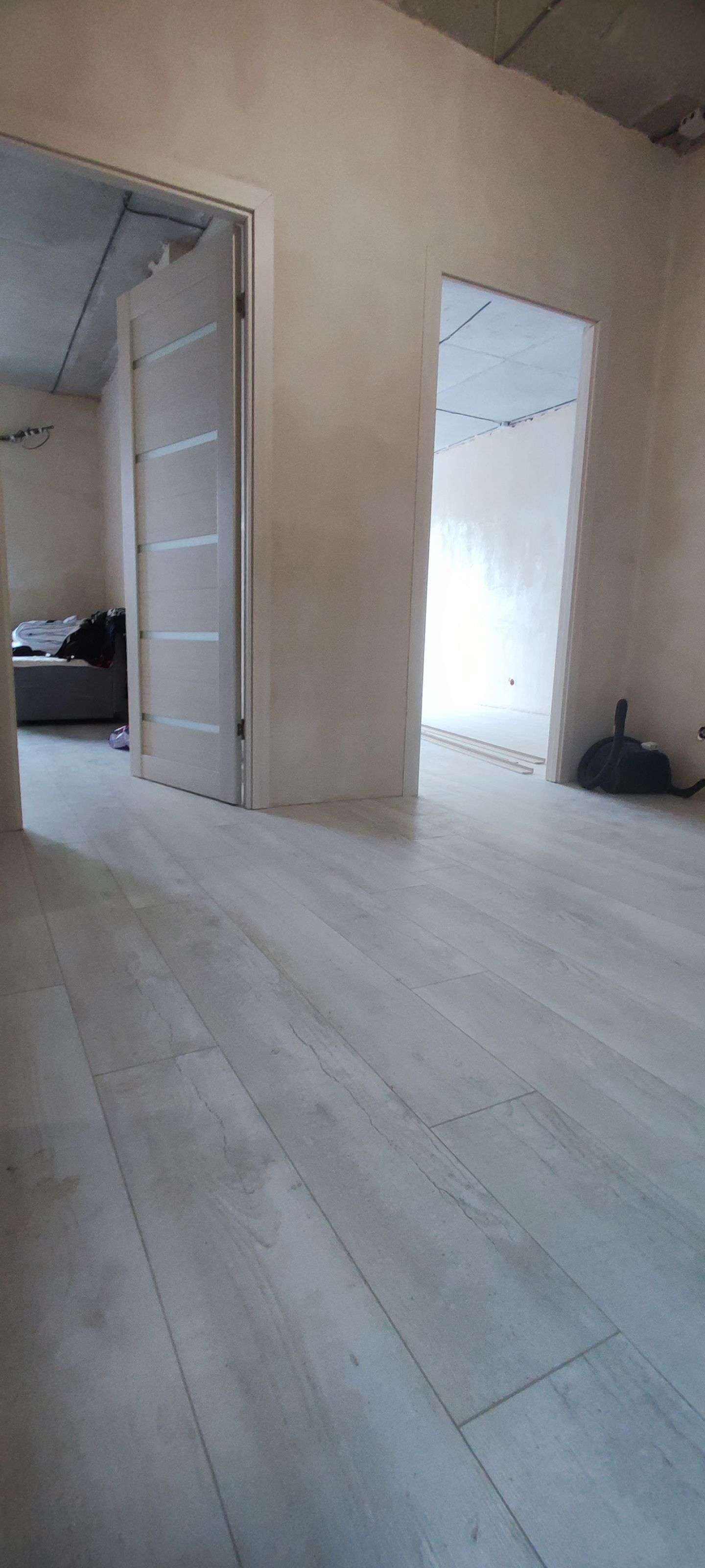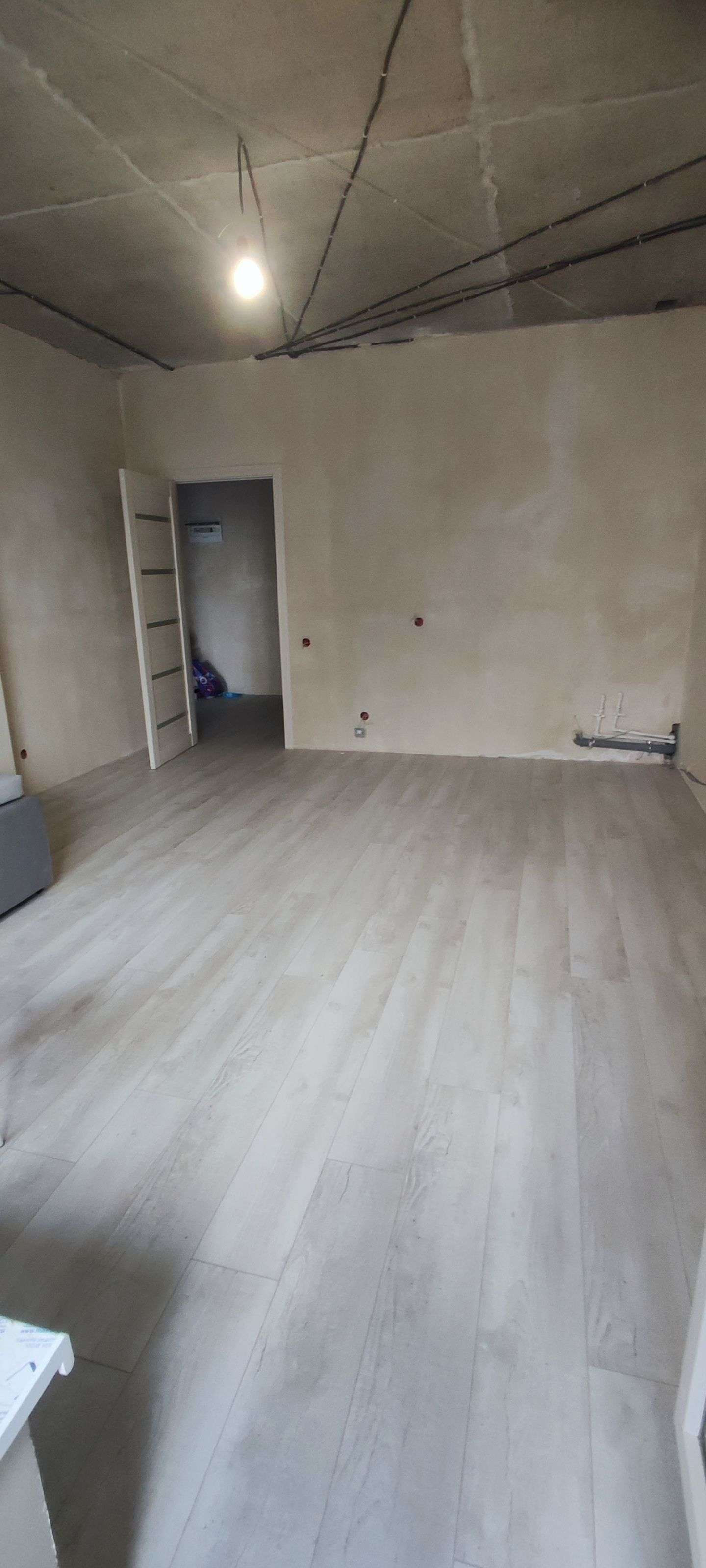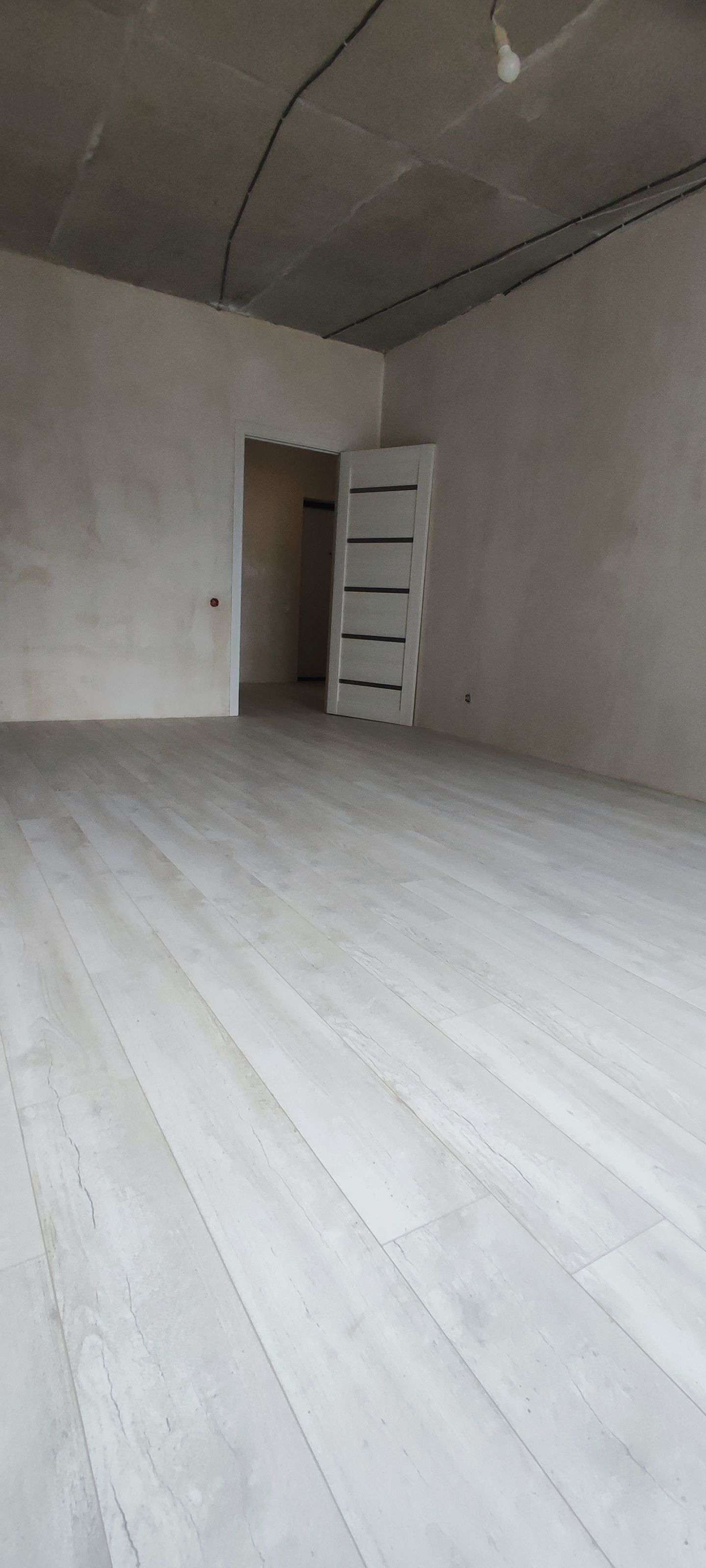 Во всех комнатах постелен ламинат, подготовлены стены под обои, установлены двери, заложена трасса под кондиционер, разведена электрика, вода, и канализация.