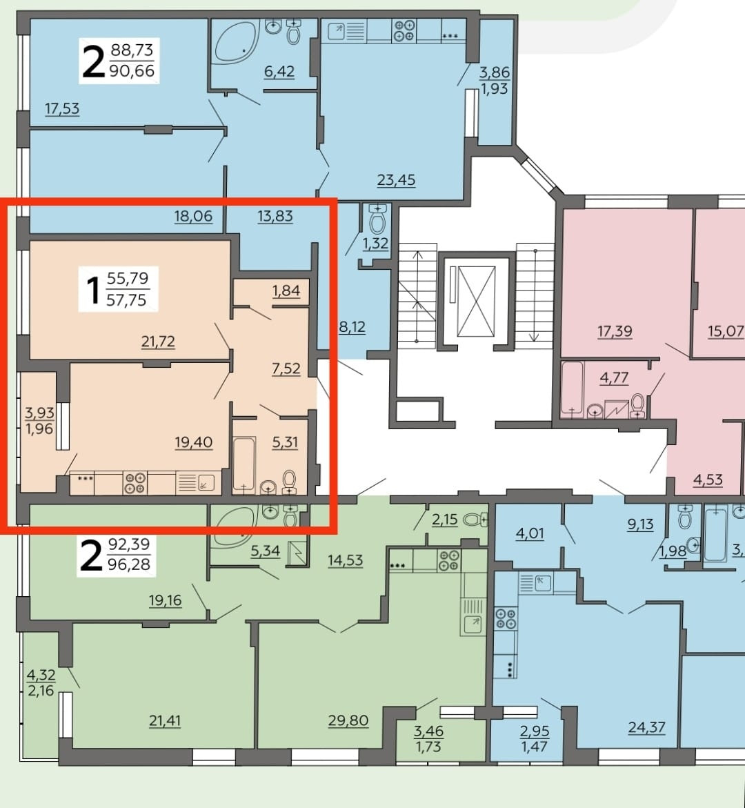 Общая площадь 57.5 м2