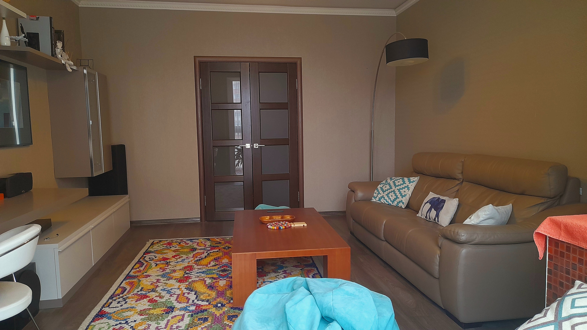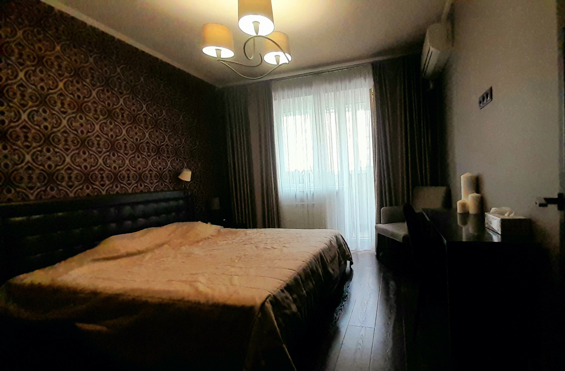Сделан дизайнерский евро-ремонт, с дорогими материалами отделки. На полу в спальне и зале дорогая толстая ламинатная доска, на кухне, в ванной и прихожей керамогранит, итальянские фактурные обои.