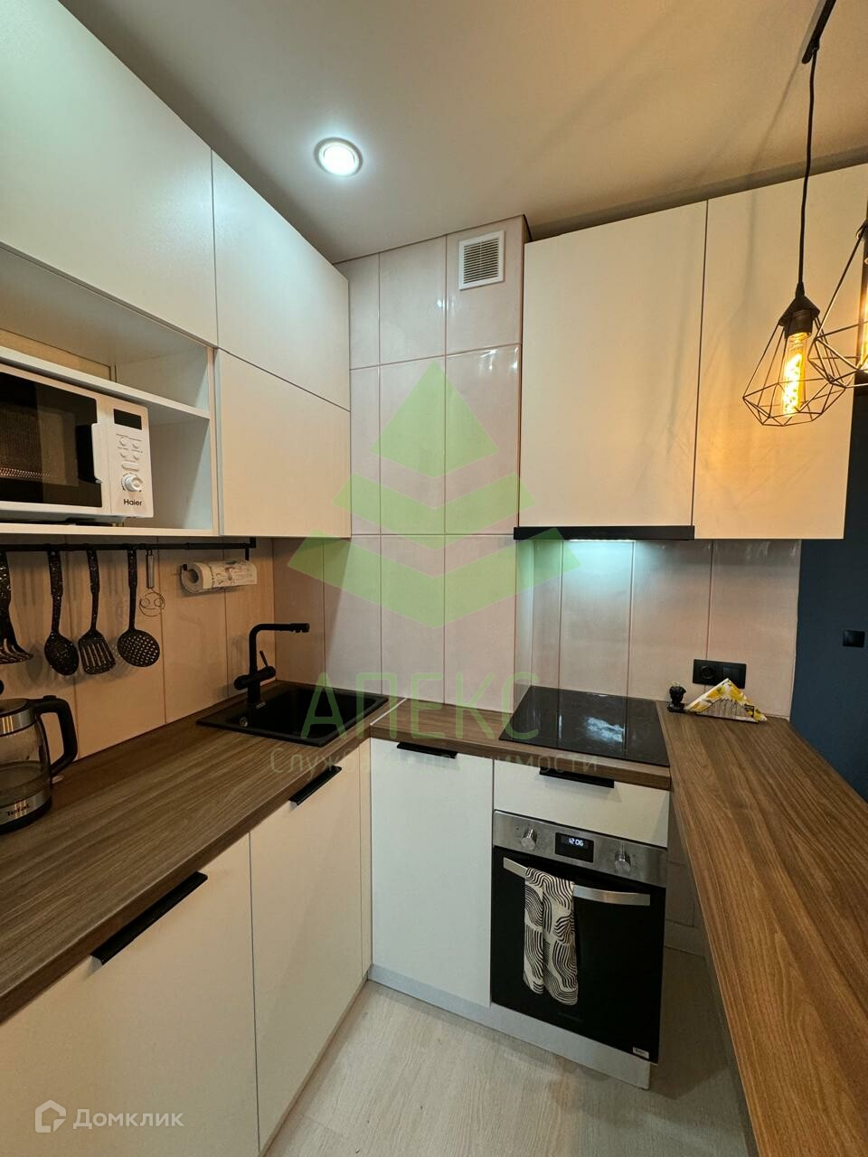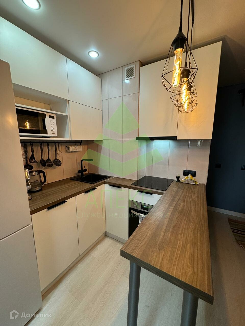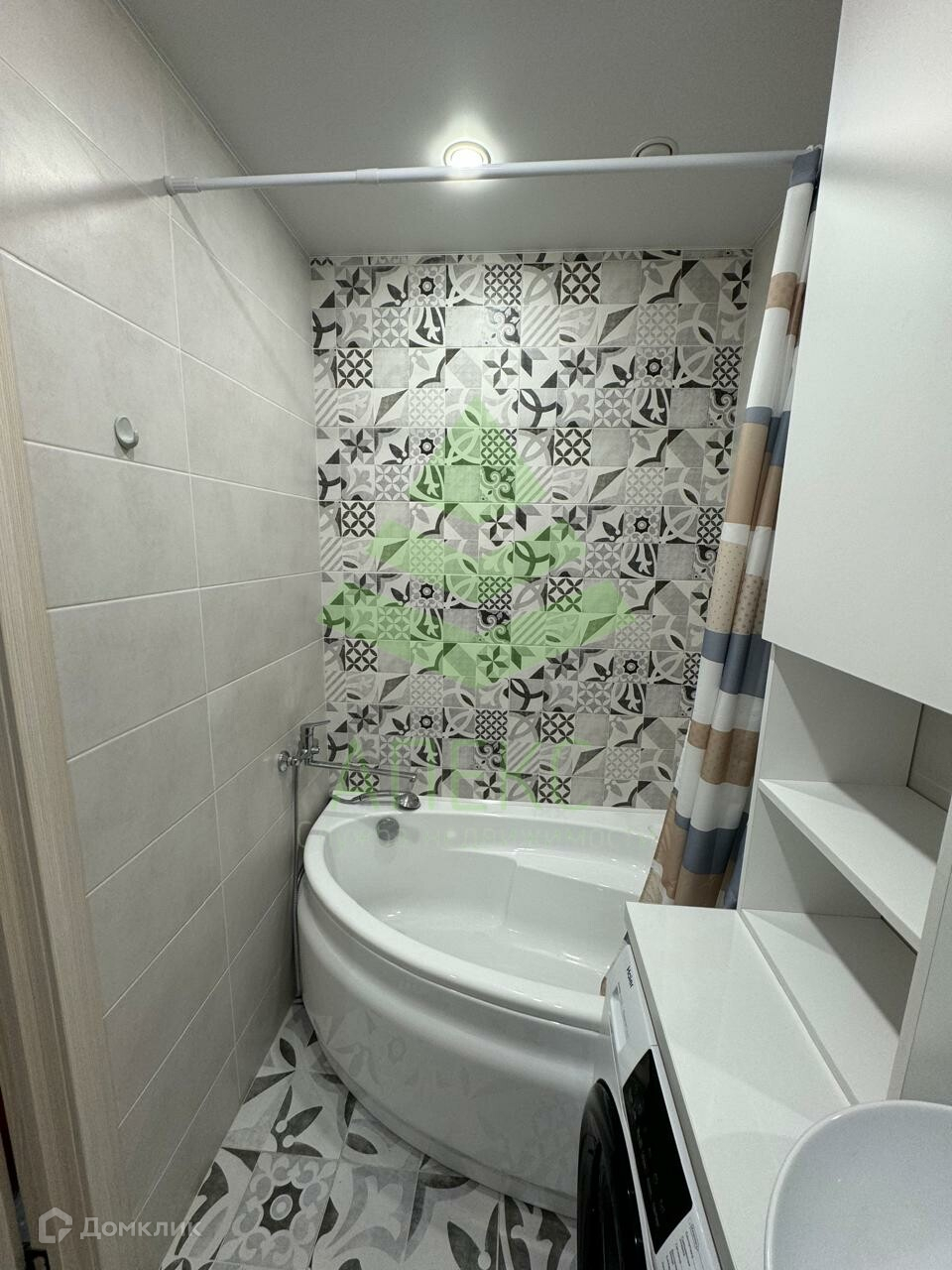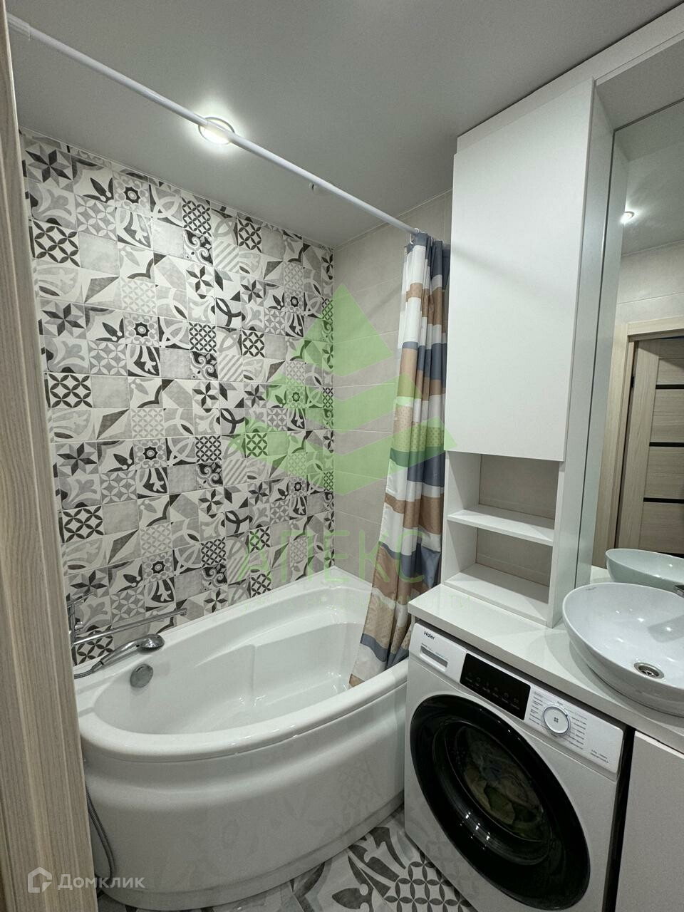 В квартире есть всё необходимое. Ванная комната совмещена с санузлом, но вместо душевой установлена полноценная ванна. На кухне нашлось место для посудомоечной машины, духовки, холодильника и удобного барного стола.