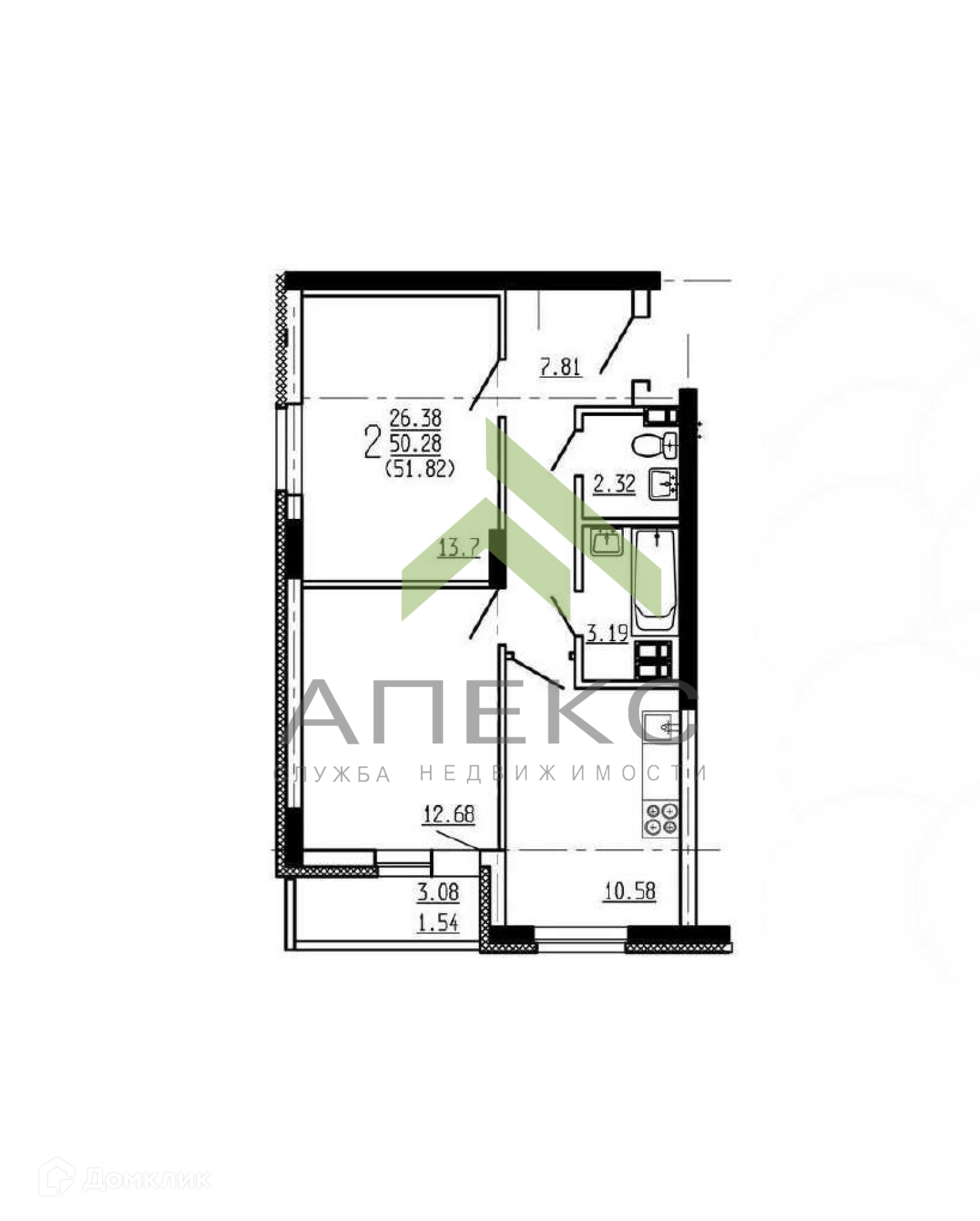 Общая площадь 51.4 м2