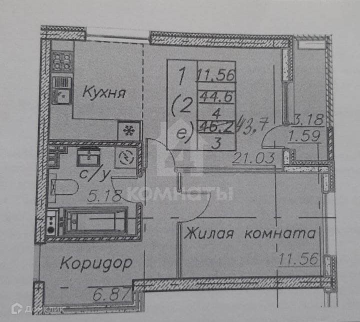 Описание: квартира общей площадью 43,7 кв м с кухней-гостиной 21,03 кв м. Ремонт от застройщика "ВДК".