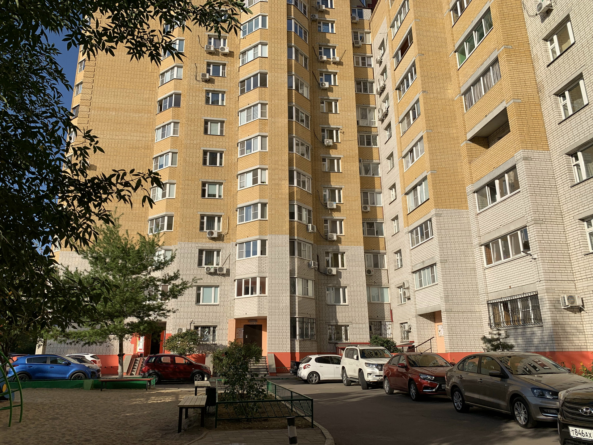 Вид из квартиры на благоустроенный зеленый двор с детской и спортивной площадками.