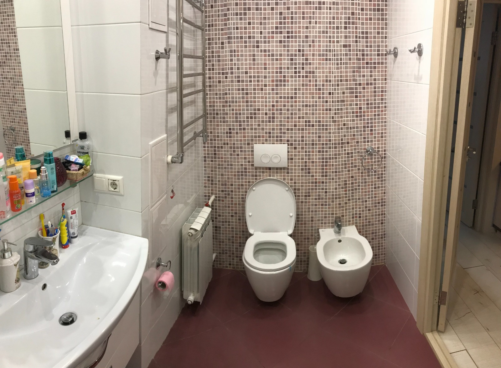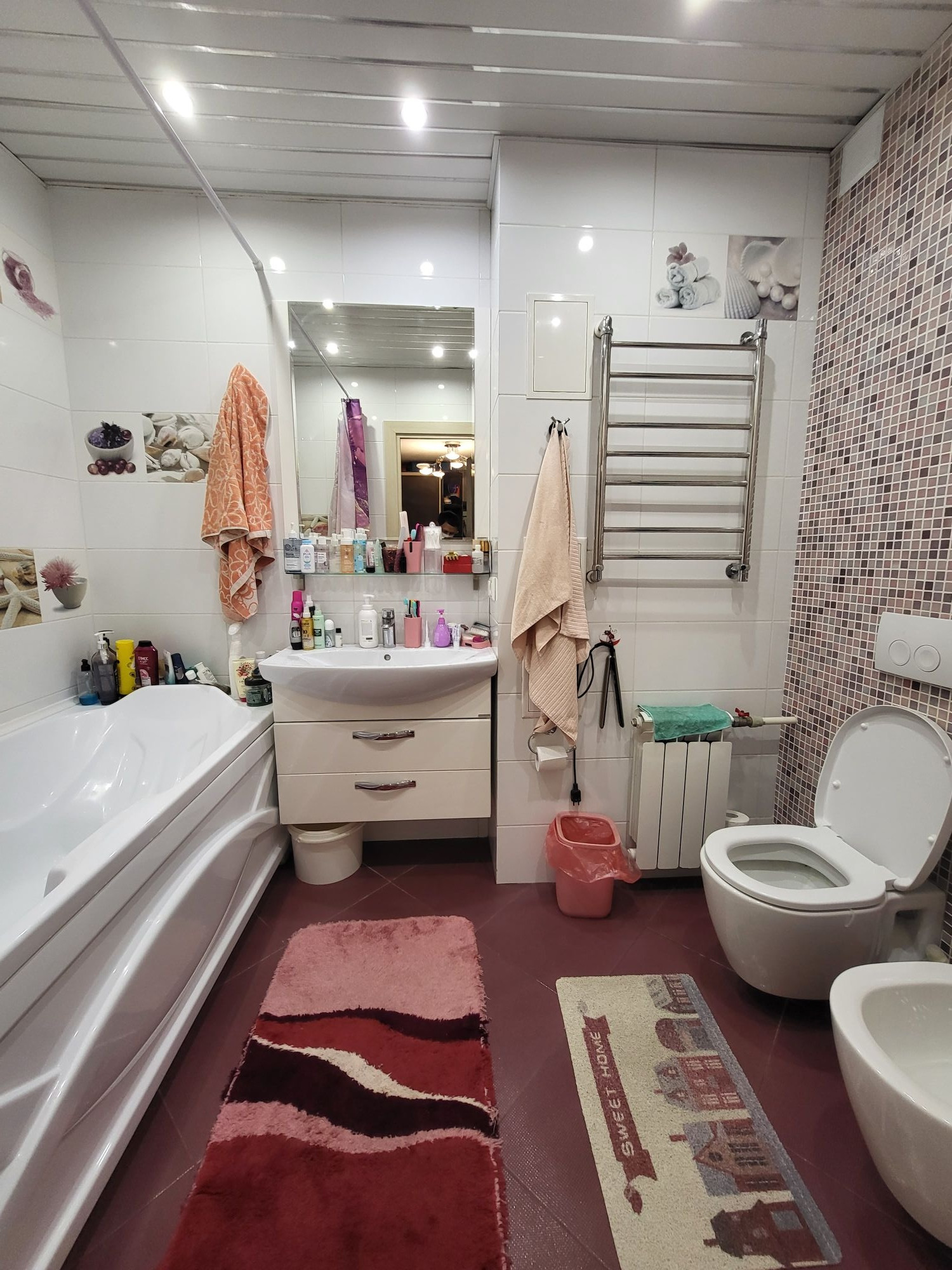 Санузлы подключены напрямую к конализации, есть разрешение, спрятанный боулер, теплые полы.