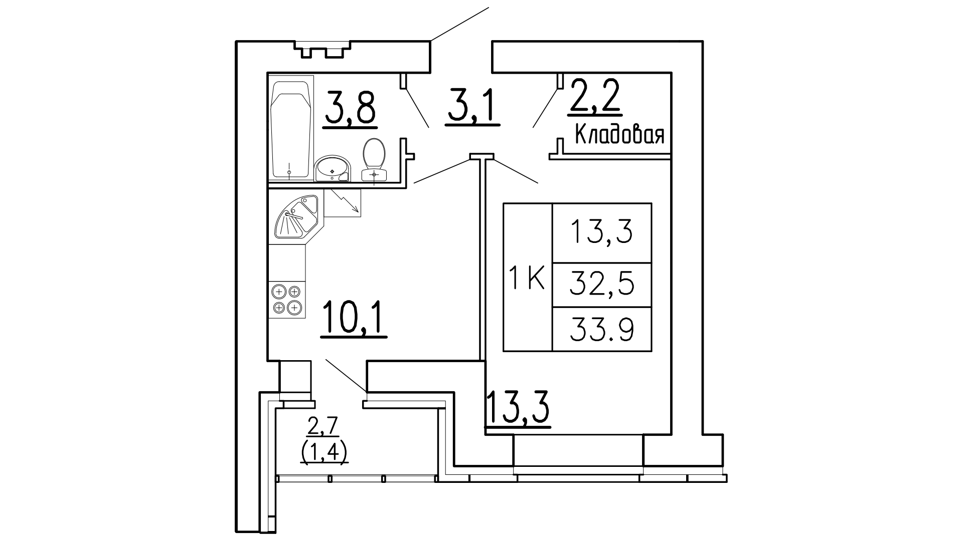 Общая площадь 33.9 м2