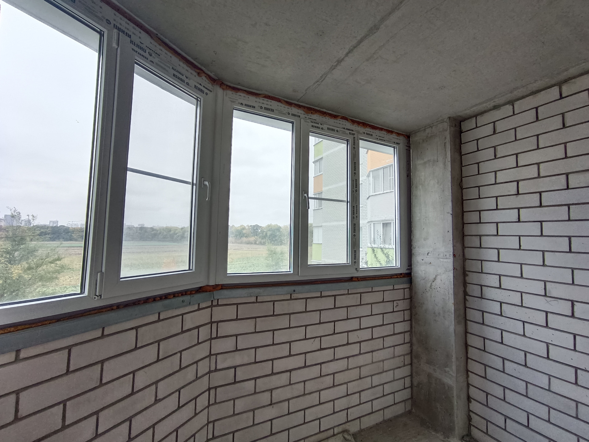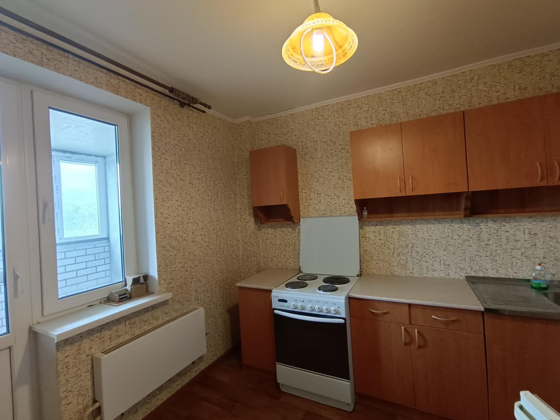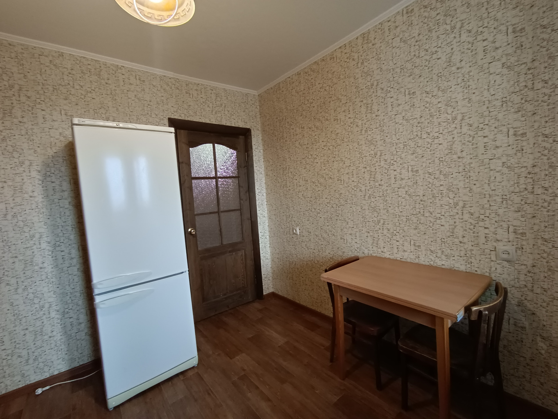 Квадратная кухня -9м2, с выходом на лоджию. На первое время есть все необходимое для жизни - кухонная стенка, холодильник, обеденный стол. Лоджия огромная, если ее утеплить, будет кабинет или обеденная зона, плюсом к кухне. Очень умиротворяющий вид из окон, с перспективой на поля и посадки.