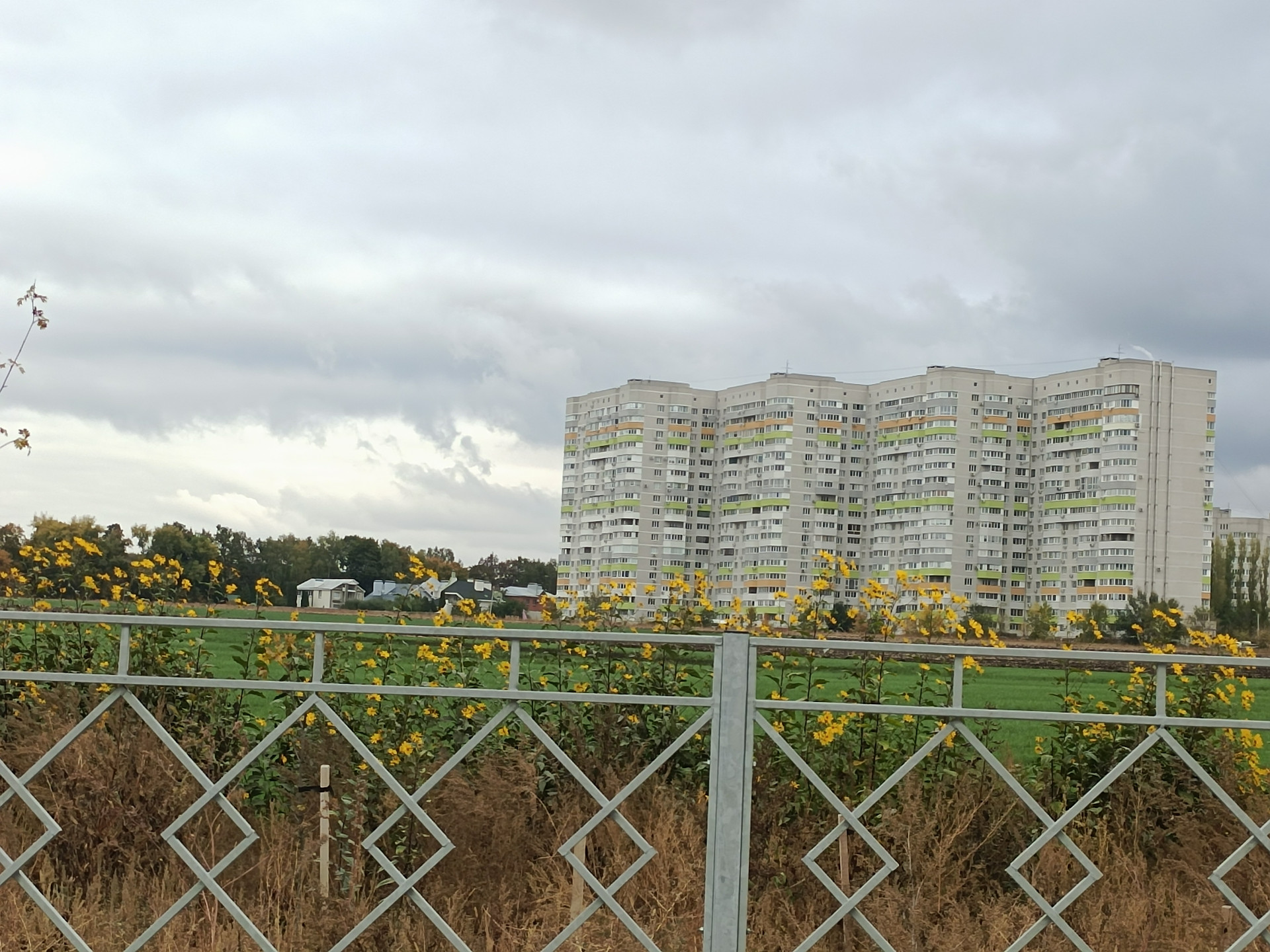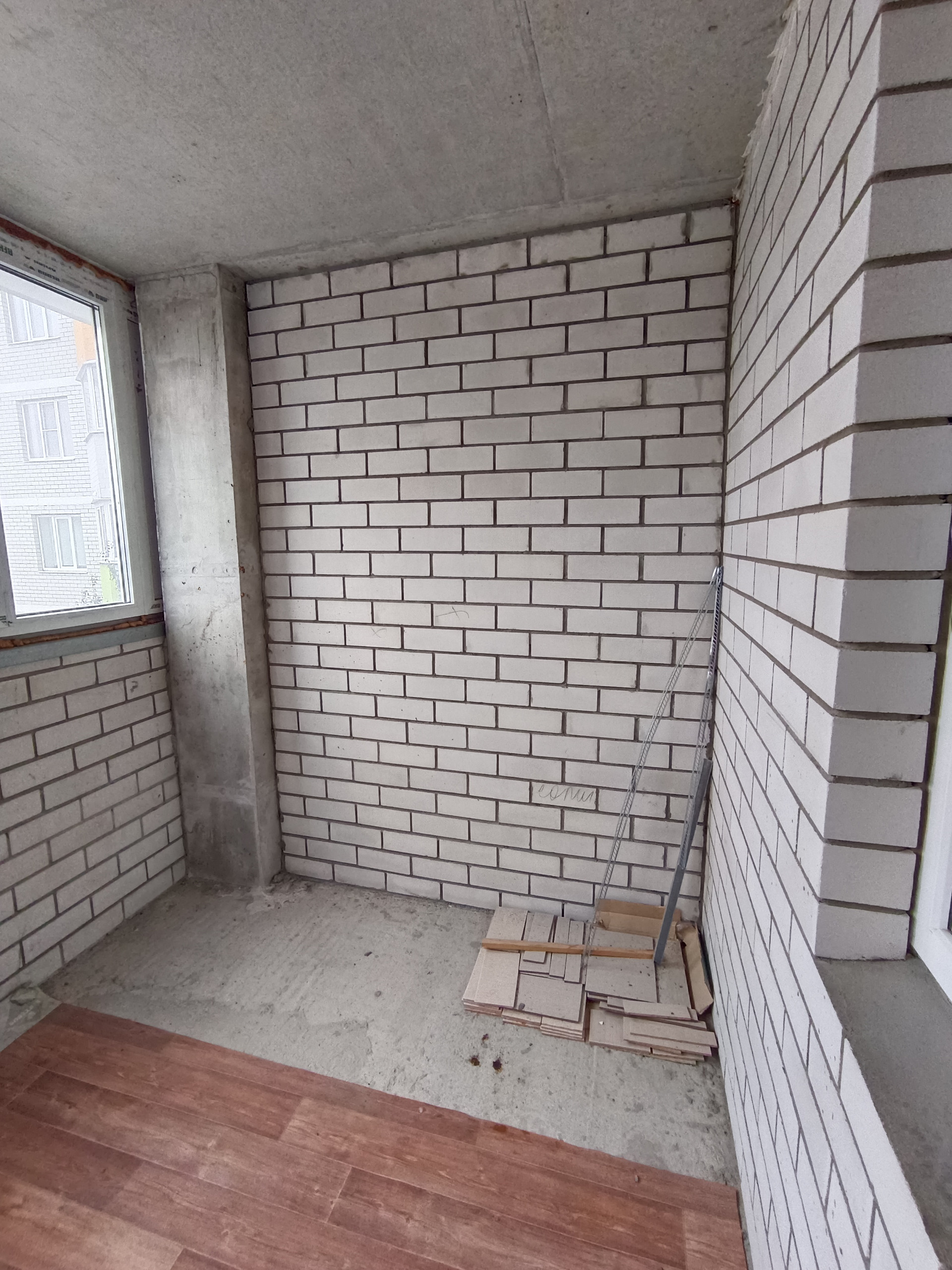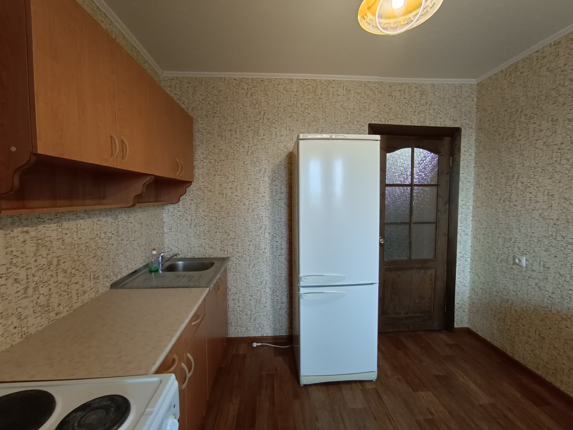 Квадратная кухня -9м2, с выходом на лоджию. На первое время есть все необходимое для жизни - кухонная стенка, холодильник, обеденный стол. Лоджия огромная, если ее утеплить, будет кабинет или обеденная зона, плюсом к кухне. Очень умиротворяющий вид из окон, с перспективой на поля и посадки.