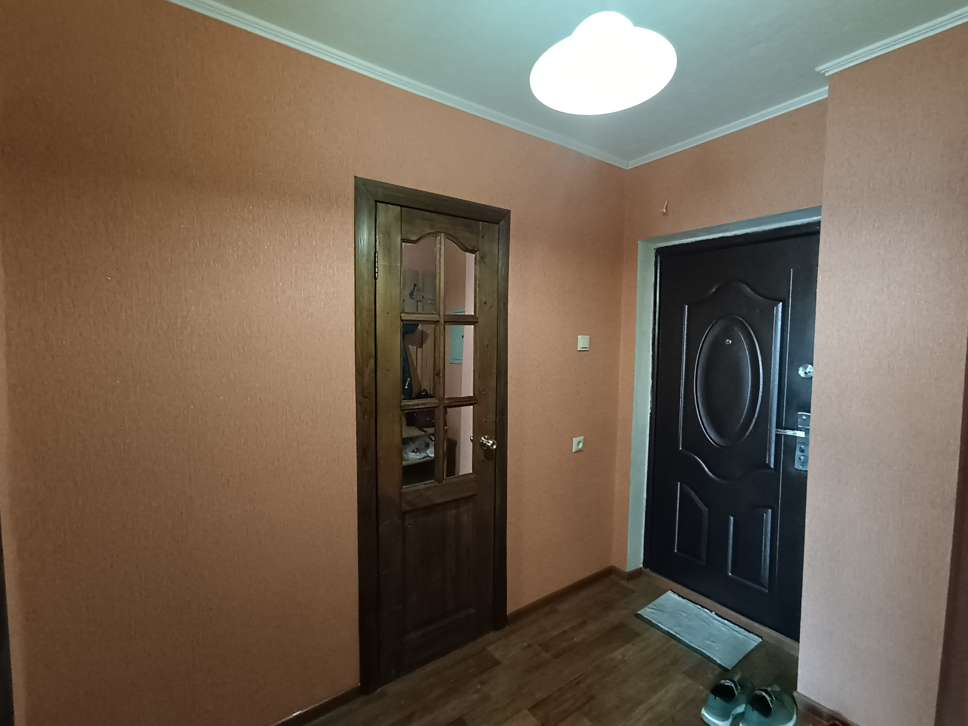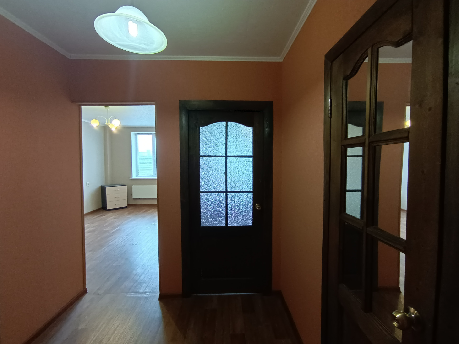Прихожая просторная, достаточно места для одежды и обуви.