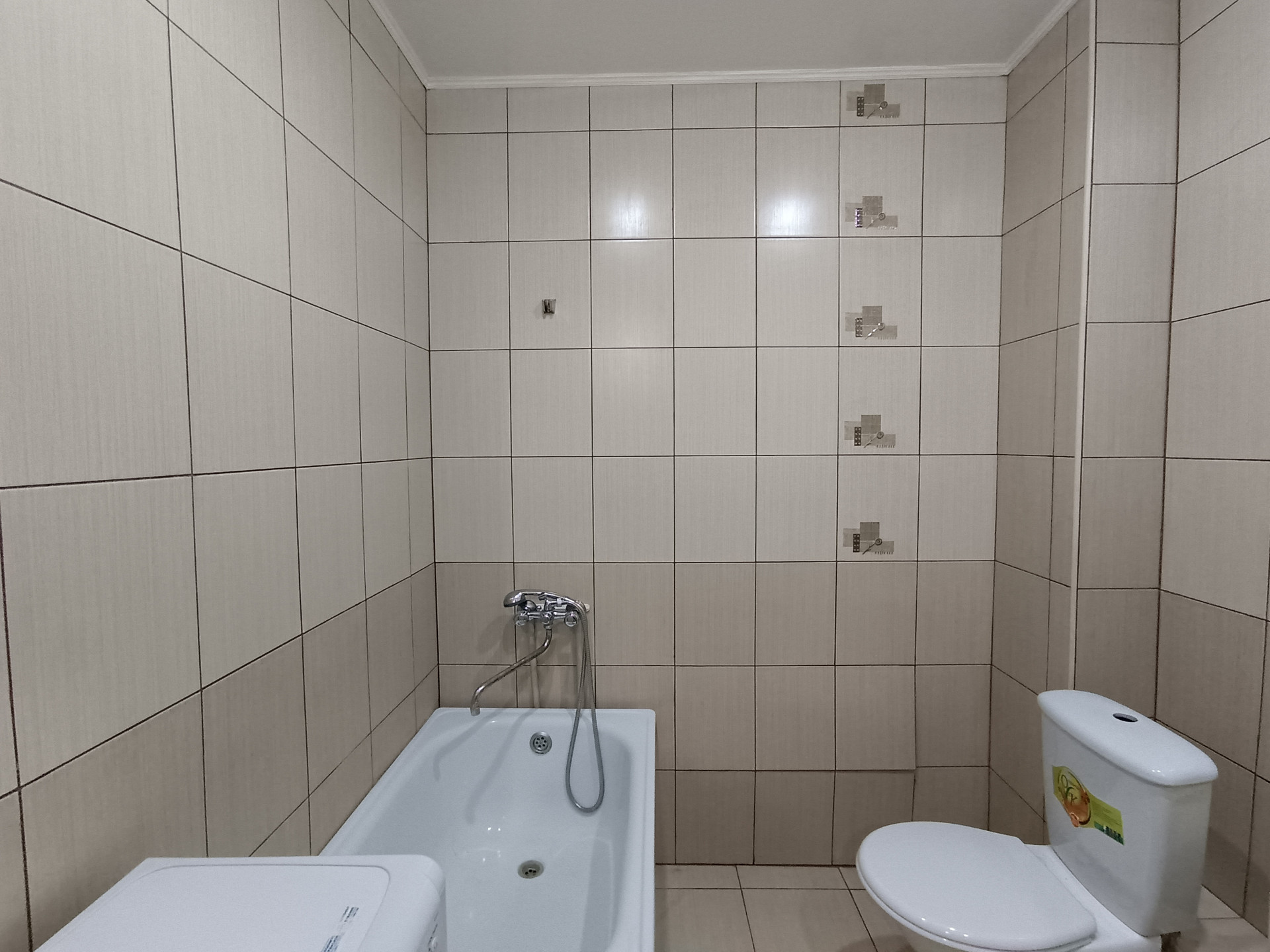 Санузел совмещенный, современная, в постельных тонах, плитка на стенах, сантехника в отличном состоянии, новая стиральная машинка.