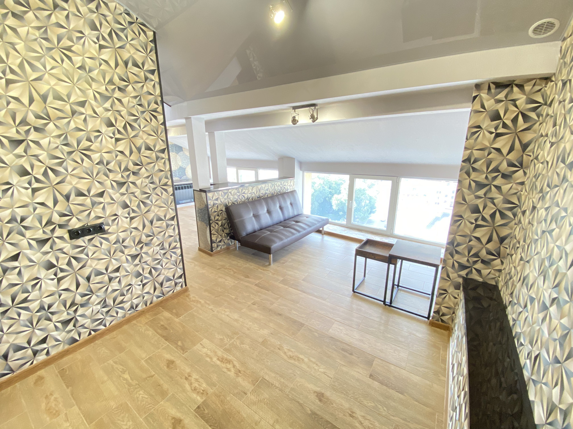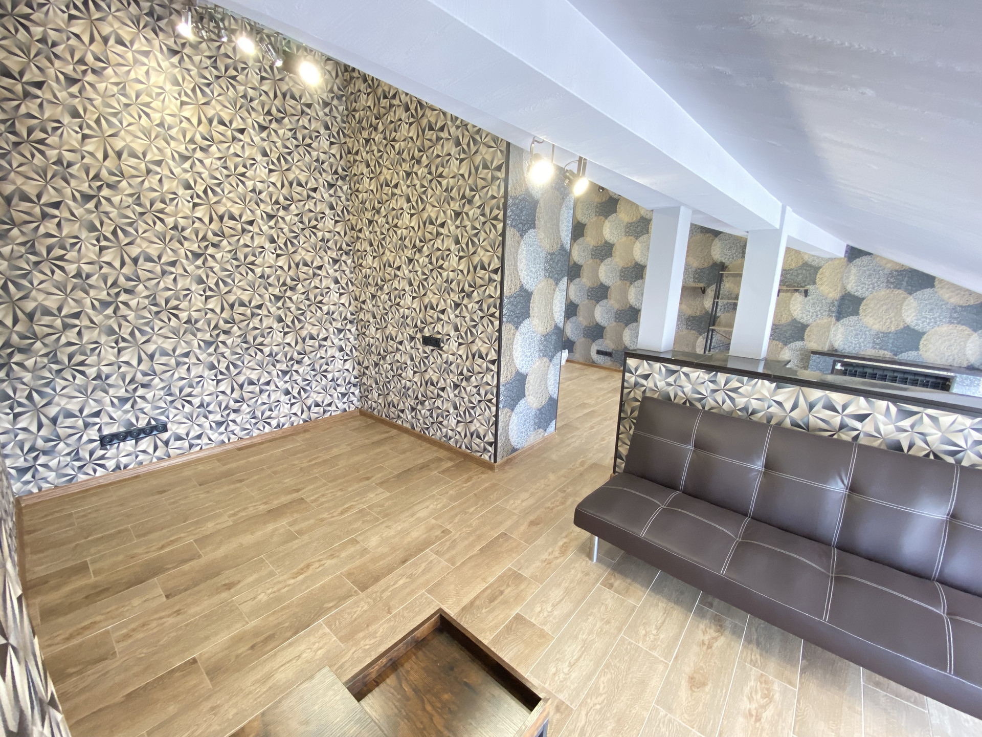 В офисе сделан настоящий шикарный ремонт. Смонтирован собственный индивидуальный санузел. Дизайнерским решением офис разделен невысокой перегородкой на 2 зоны.