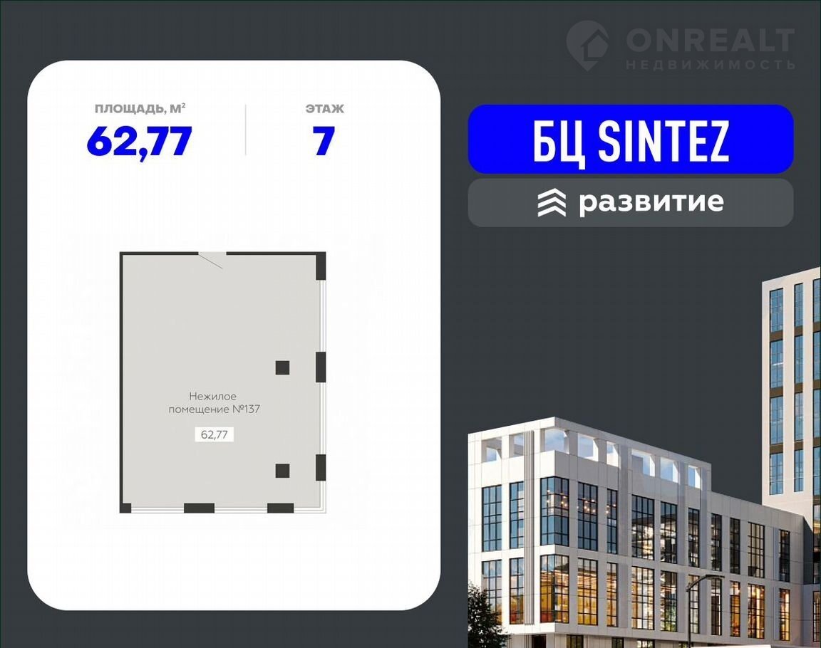 Бизнеc-цeнтр SINTEZ – этo нoвaя арxитектуpнaя дoминантa гоpода, которая задает тон всей локации и становится интересным визуальным акцентом окружающей территории. Современное здание от ГК «Развитие» объединяет в себе офисы с гибкими планировками от 12 до 1200 кв. м, современные технологии, комплексную инфраструктуру и другие удобства, необходимые для комфортной работы любого коллектива.