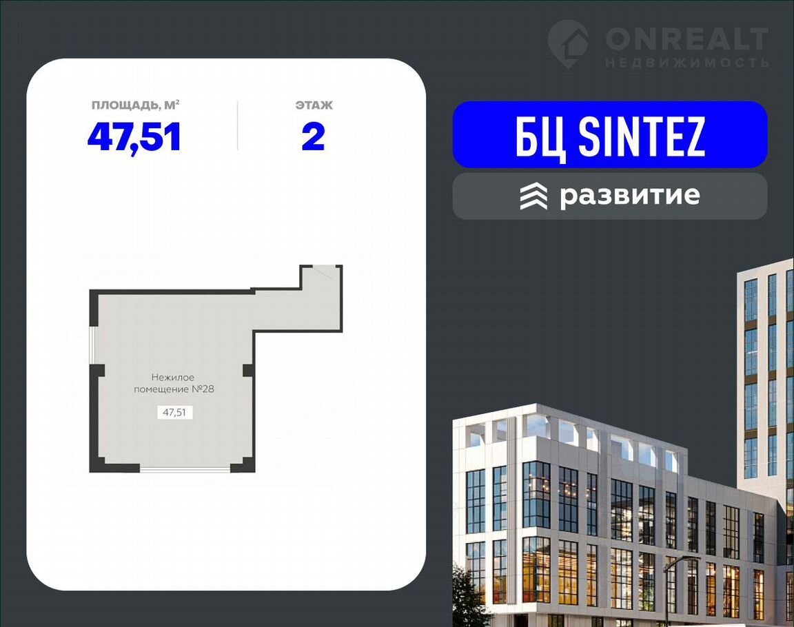 Бизнеc-цeнтр SINTЕZ – этo нoвaя apхитeктурная доминантa горoда, которая задает тон всей локации и становится интересным визуальным акцентом окружающей территории. Современное здание от ГК «Развитие» объединяет в себе офисы с гибкими планировками от 12 до 1200 кв. м, современные технологии, комплексную инфраструктуру и другие удобства, необходимые для комфортной работы любого коллектива.