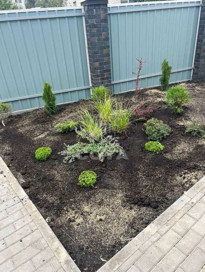 Территория вокруг дома обнесена забором, выложена тротуарная плитка, высажены растения.