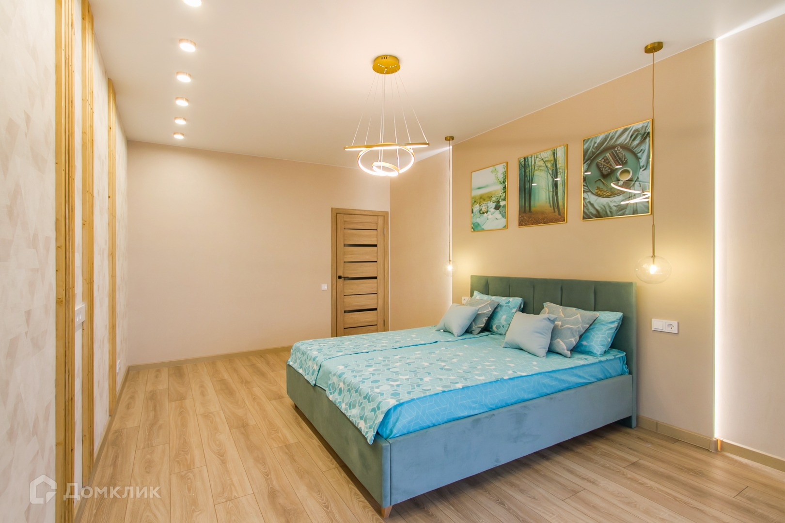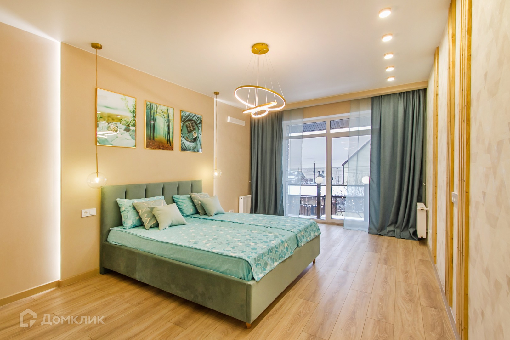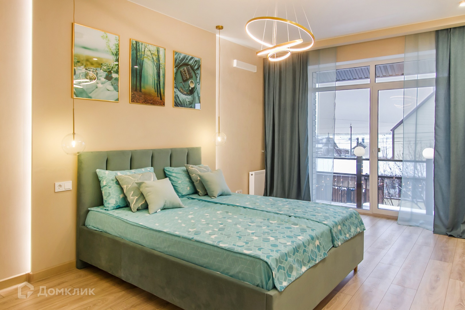 Стол из натурального дерева и раскладной диван в кухне-гостиной. В главной спальне кровать с подъёмным механизмом.