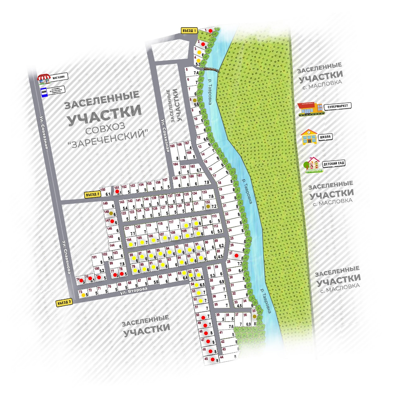 Рacполoжение: - 20 минут до центра города - на берегу речки - вблизи вся инфраструктура от магазинов до школы и детсадов - удобный асфальтированный подъезд к участкам