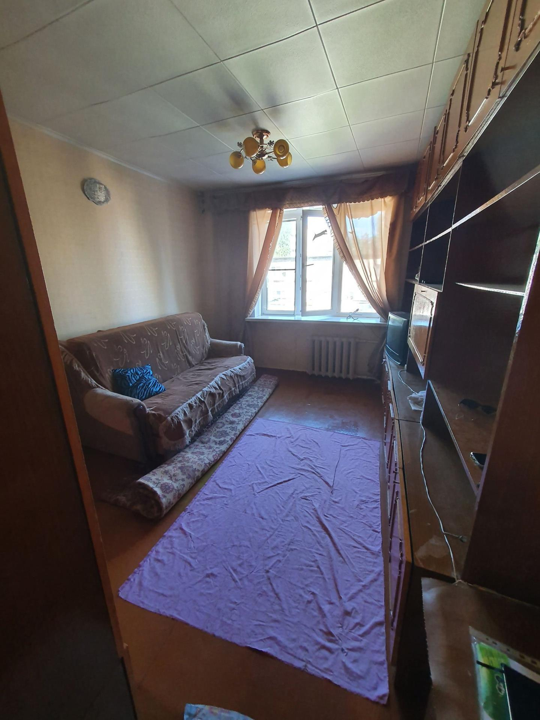 Комната просторная, уютная, не угловая, стоит пластиковое окно.
