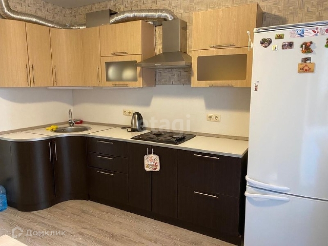 Квартира полностью обставлена бытовой техникой и мебелью: кухонный гарнитур, холодильник, стиральная машина, кондиционер, телевизор, диван, шкаф.
