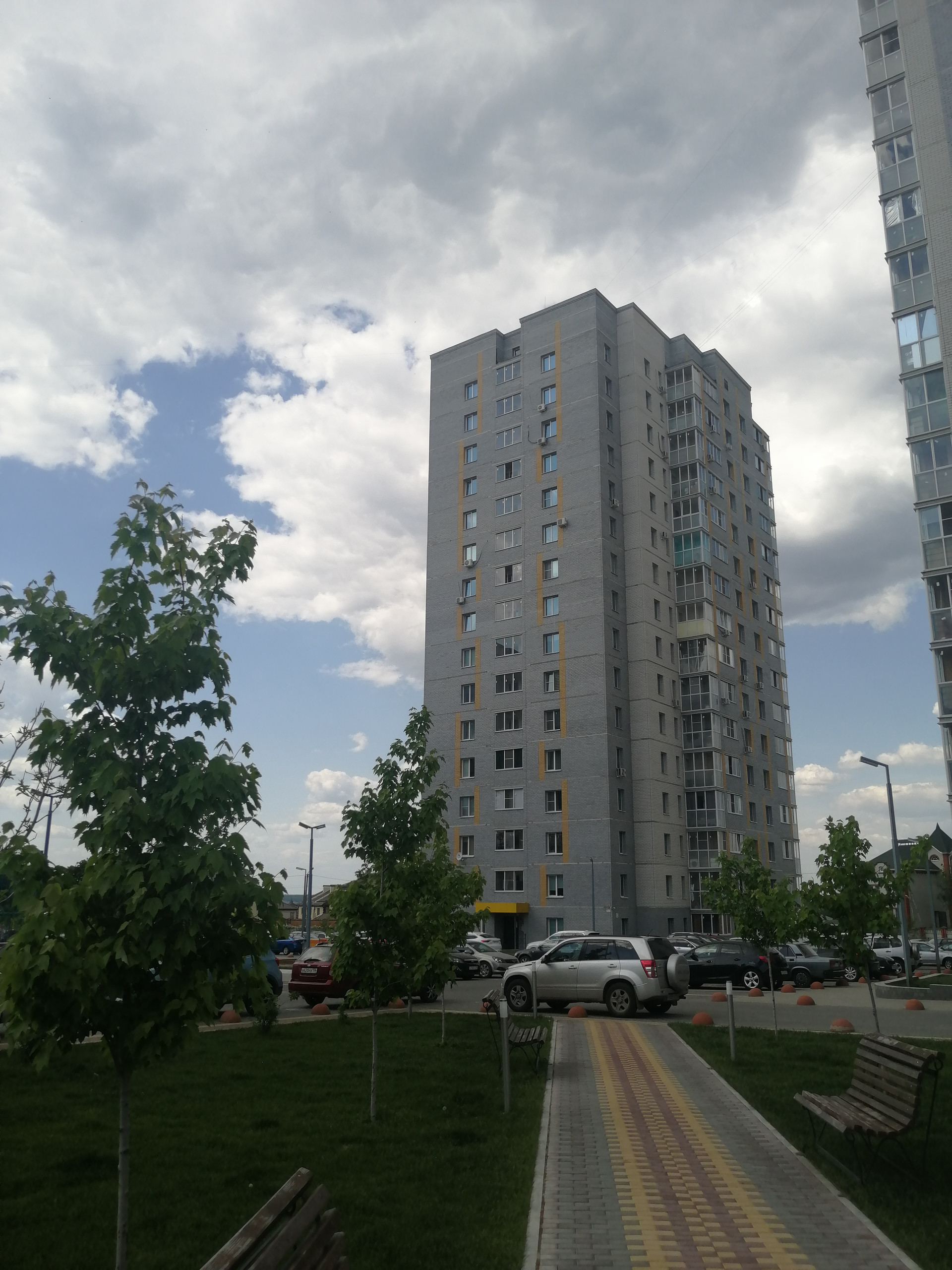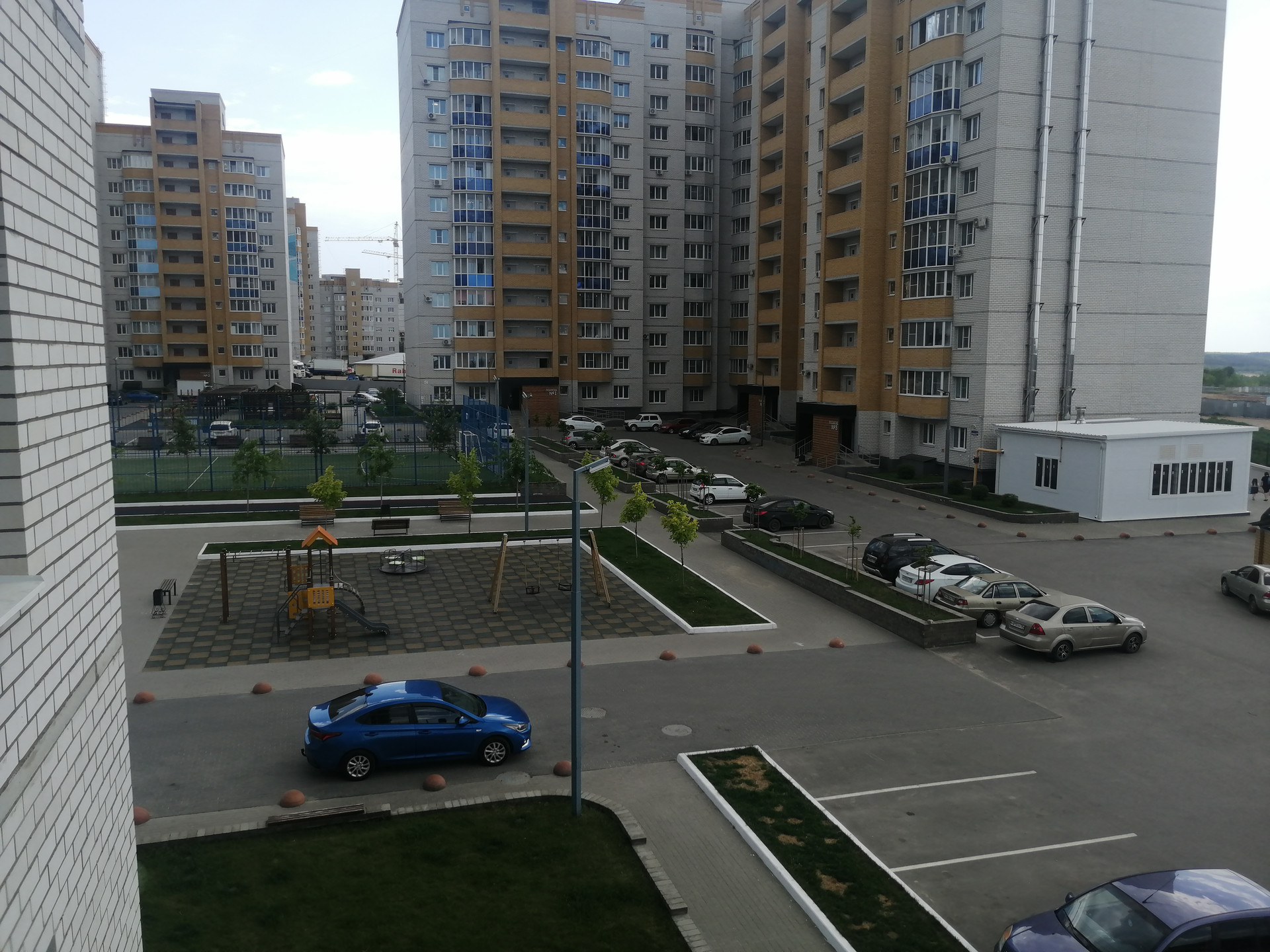Шикарный двор, детская и спортивная площадки, футбольное поле, магазины рядом.