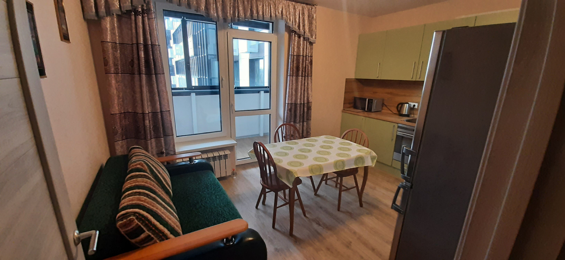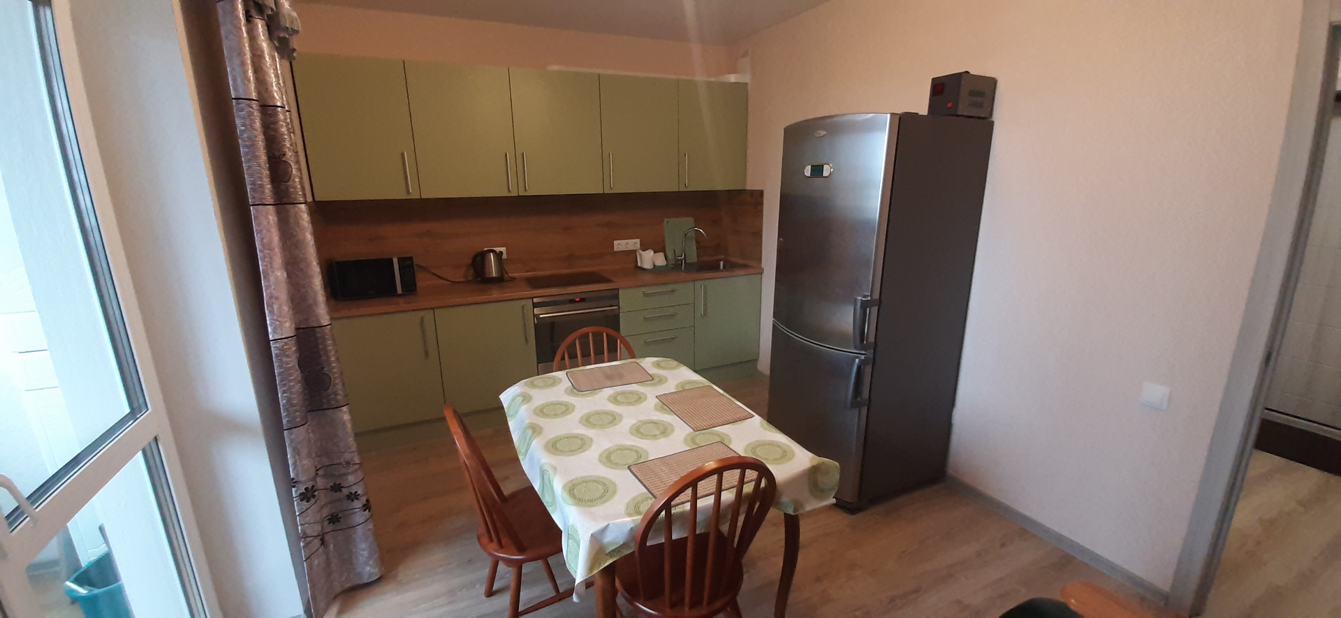 - оборудованная кухня: варочная панель, микроволновая печь, духовой шкаф, вытяжка, большой двухкамерный холодильник, большой раздвижной стол, стулья электрический чайник, посуда, установлен фильтр очистки воды, раскладной диван;