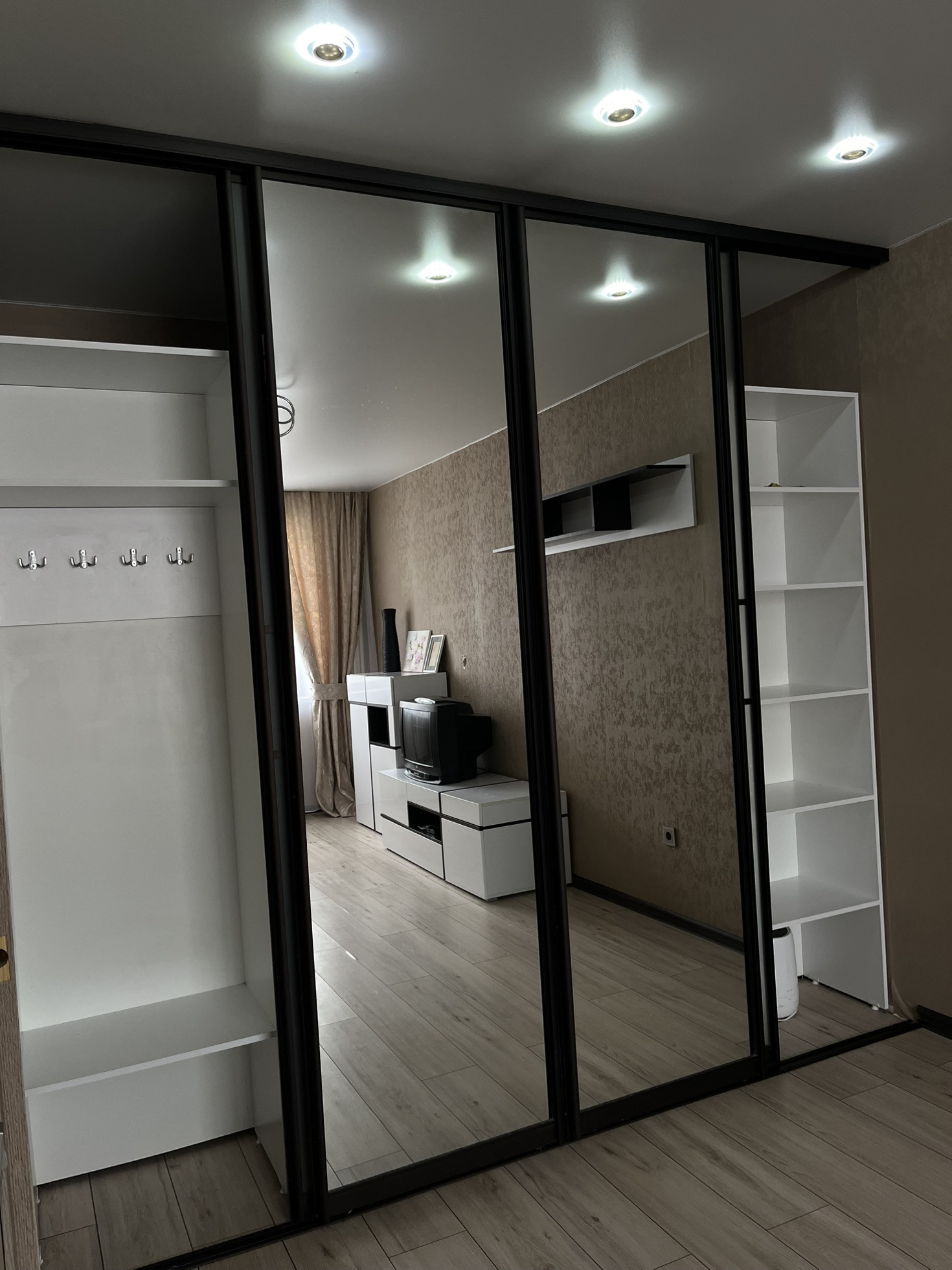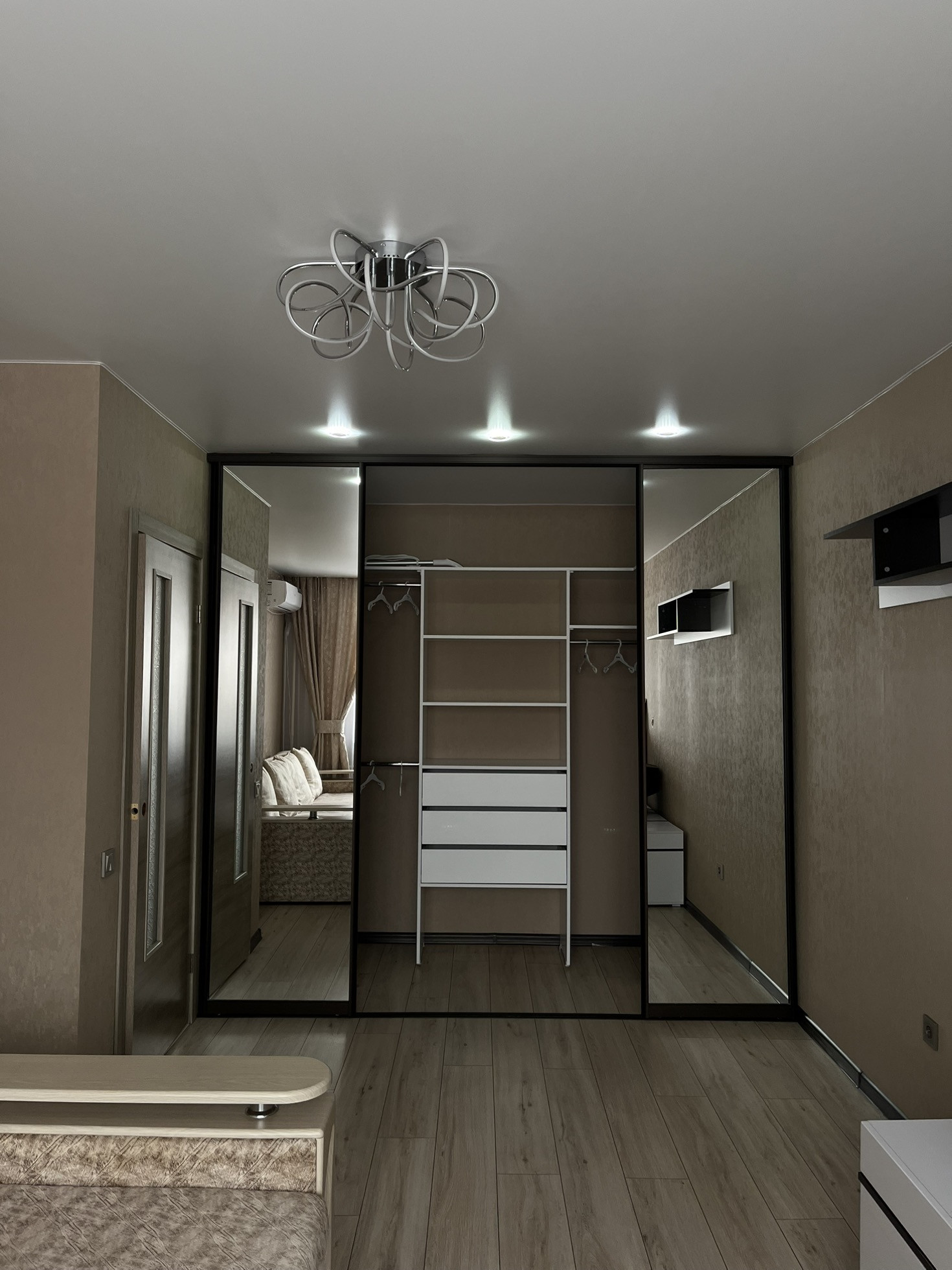 - открытая гардеробная система с полками и выдвижными ящиками;