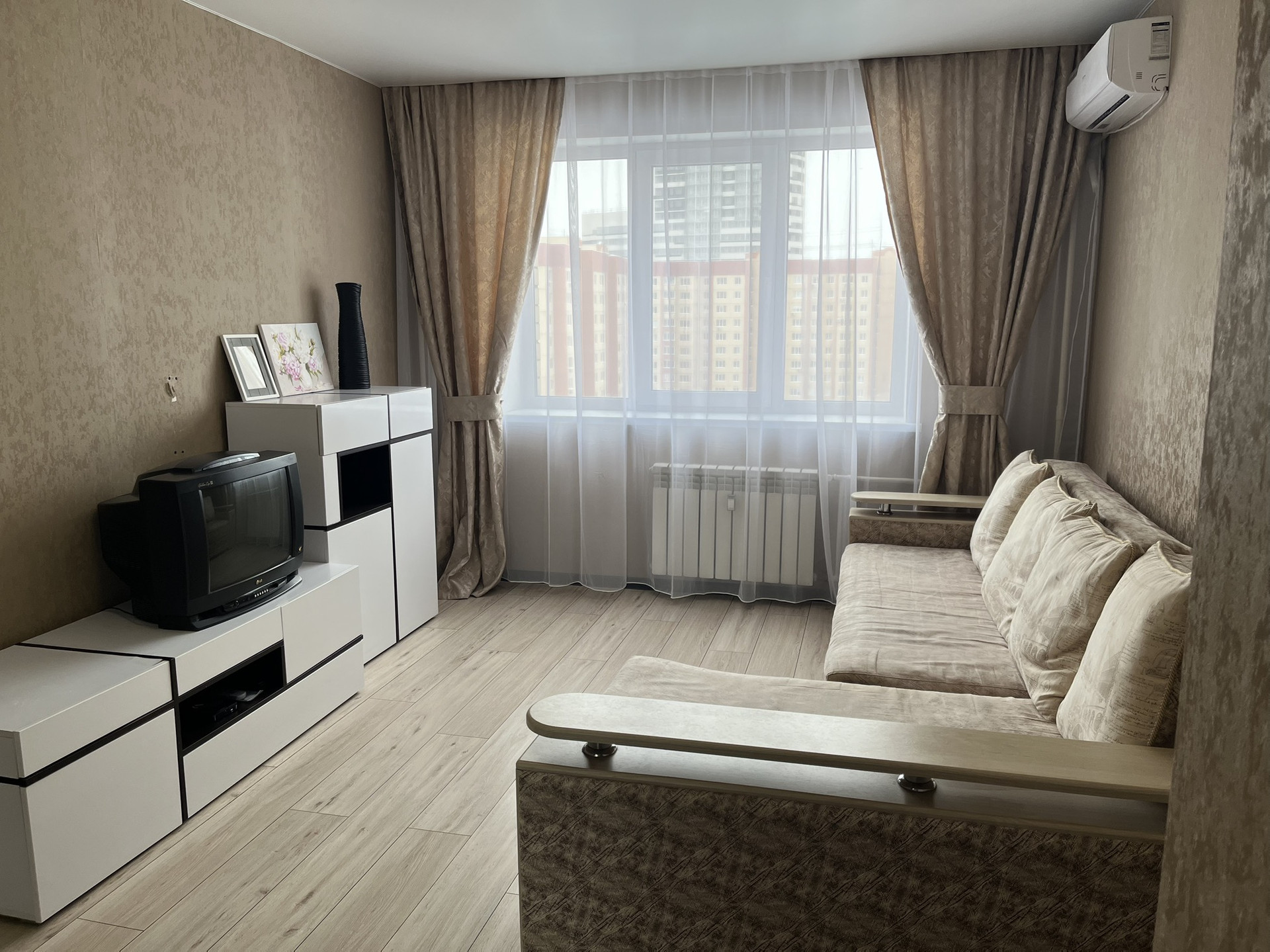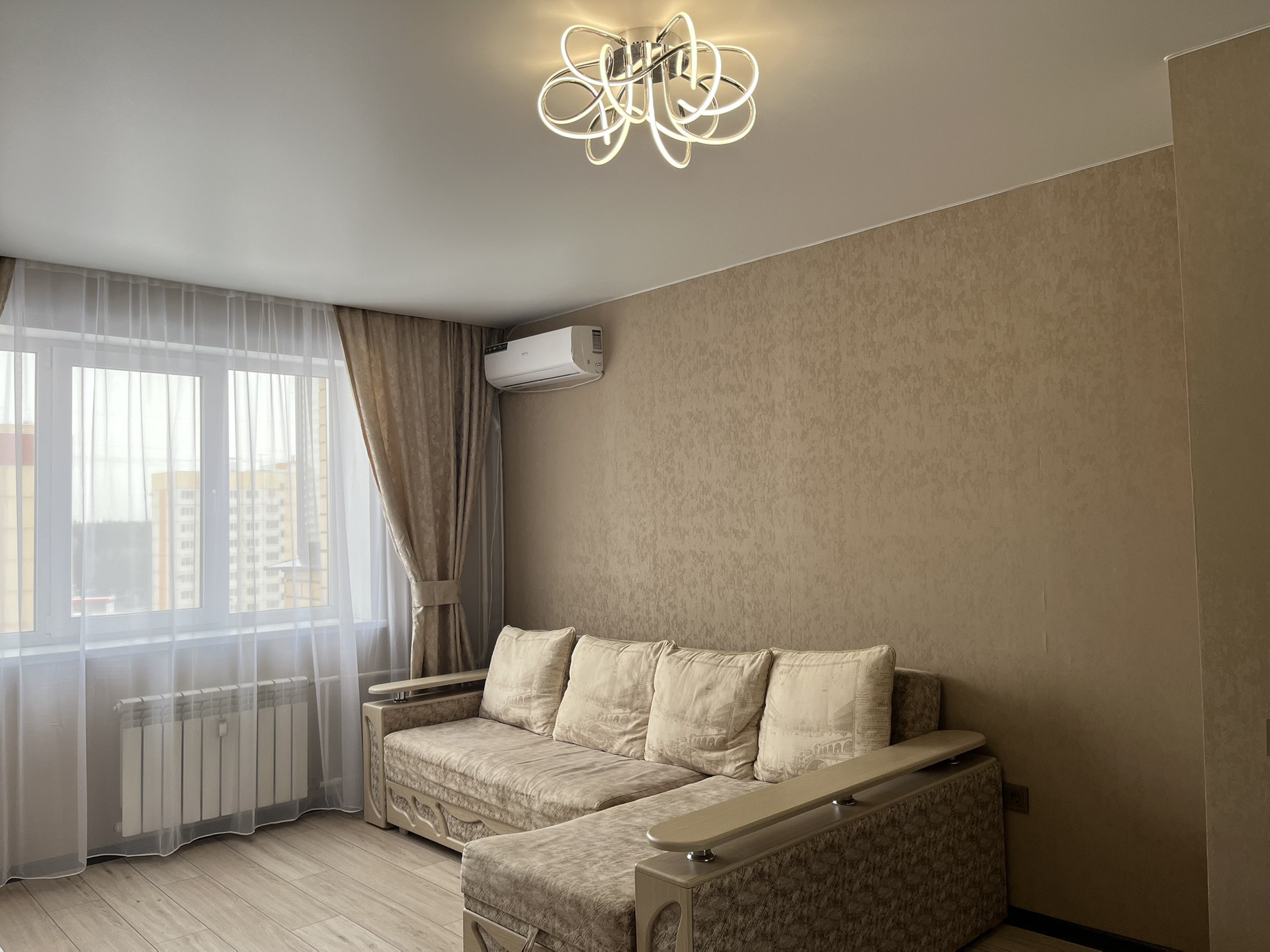 Предлагается в долгосрочную аренду светлая, однокомнатная квартира на 9 этаже 40.1 м3 с большой гардеробной зоной в ЖК «Новый Бомбей» по адресу: г.Воронеж, ул.9 Января 233/45