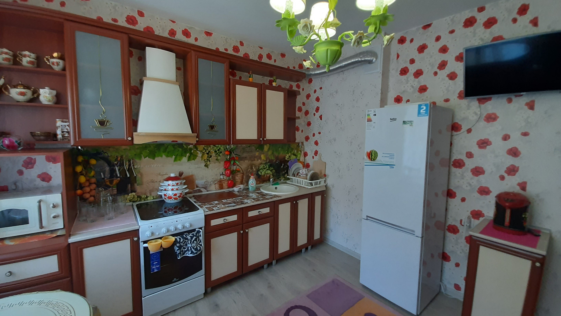 В квартире сделан евроремонт, установлена вся необходимая мебель и техника. В комнатах — уютная мебель, на кухне также есть необходимая мебель и техника: холодильник, телевизор, стиральная машина. Ванная комната оборудована ванной. Жильцы могут наслаждаться двумя лоджиями, что удобно для хранения вещей или отдыха на свежем воздухе.